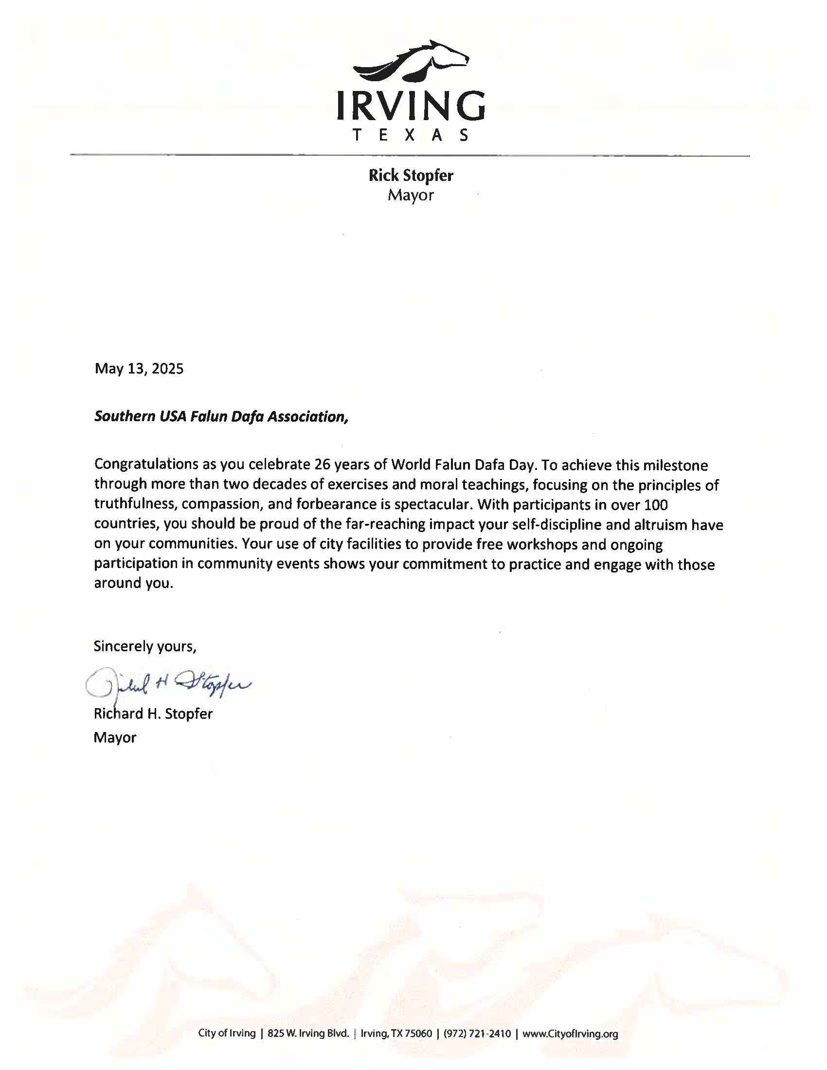 祝贺庆祝第26届世界法轮大法日。二十多年来,你们坚持通过修炼,道德提升,在真、善、忍原则的指引下达到这一重要里程碑,令人由衷钦佩。如今,全球已有一百多个国家的民众参与法轮大法的修炼,你们所展现出的自律与无私精神在社区中产生了深远的影响,值得引以为傲。你们还善用市政设施为人们提供免费教功,并持续参与社区活动,这些充分展现了你们对修炼的坚定信念与对社会的积极参与。