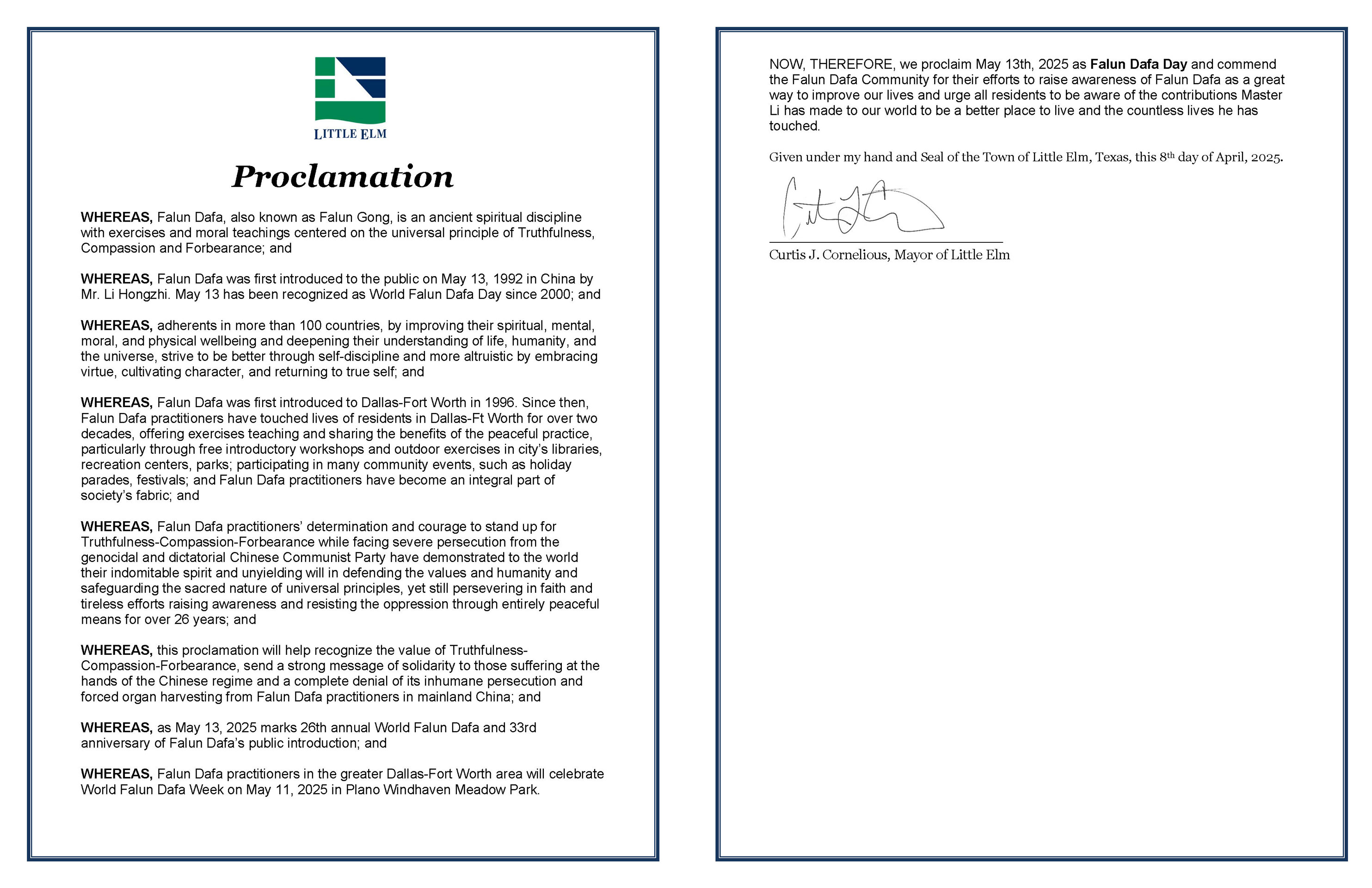 因此,我,柯蒂斯·科尼利厄斯,小榆树市市长,在这里宣布二零二五年五月十三日为德克萨斯州小榆树市市“法轮大法日”。