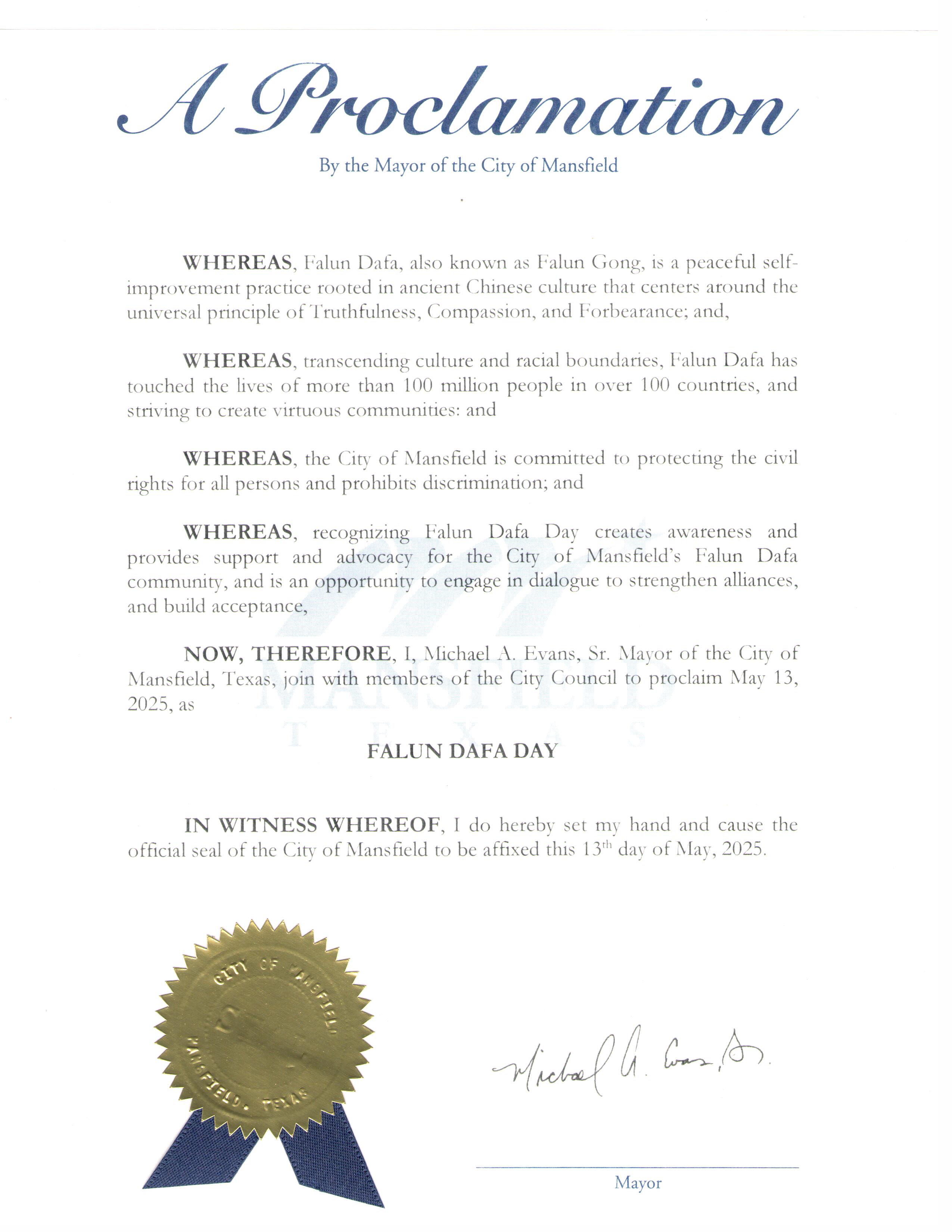 因此,我,迈克尔·埃文斯,曼斯菲尔德市市长,在这里宣布二零二五年五月十三日为德克萨斯州曼斯菲尔德市“法轮大法日”。