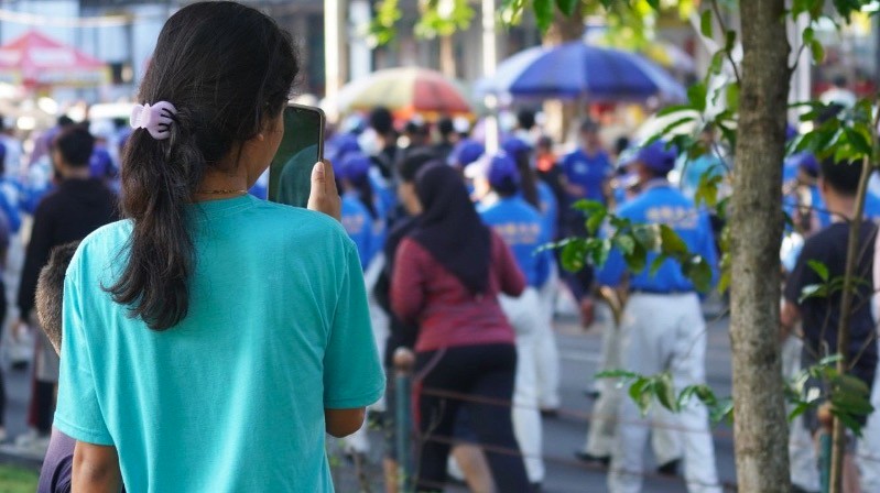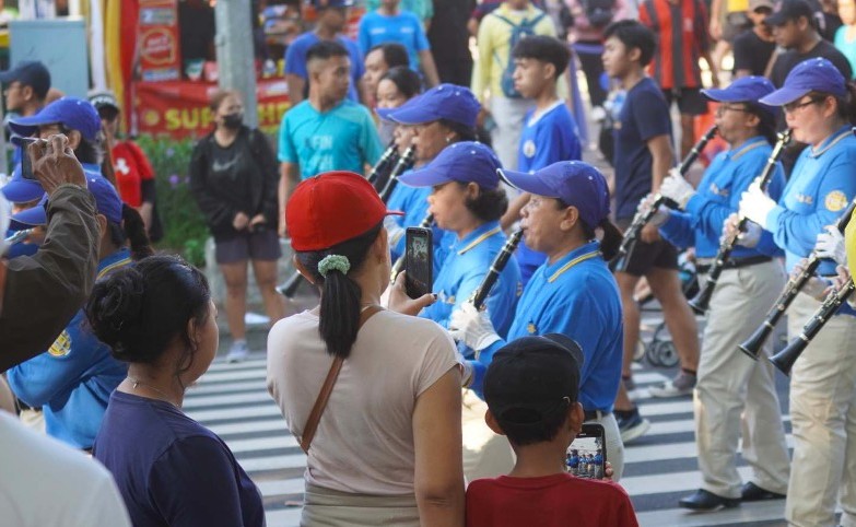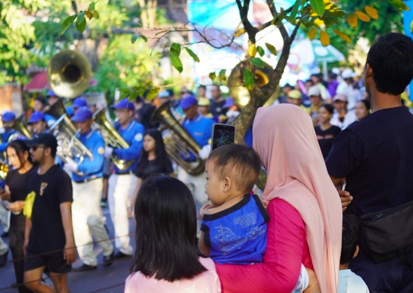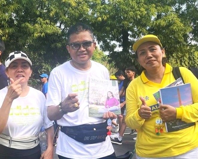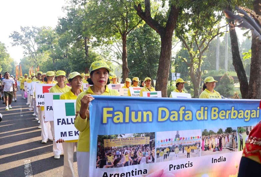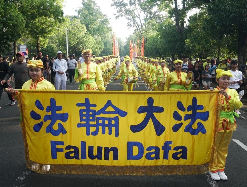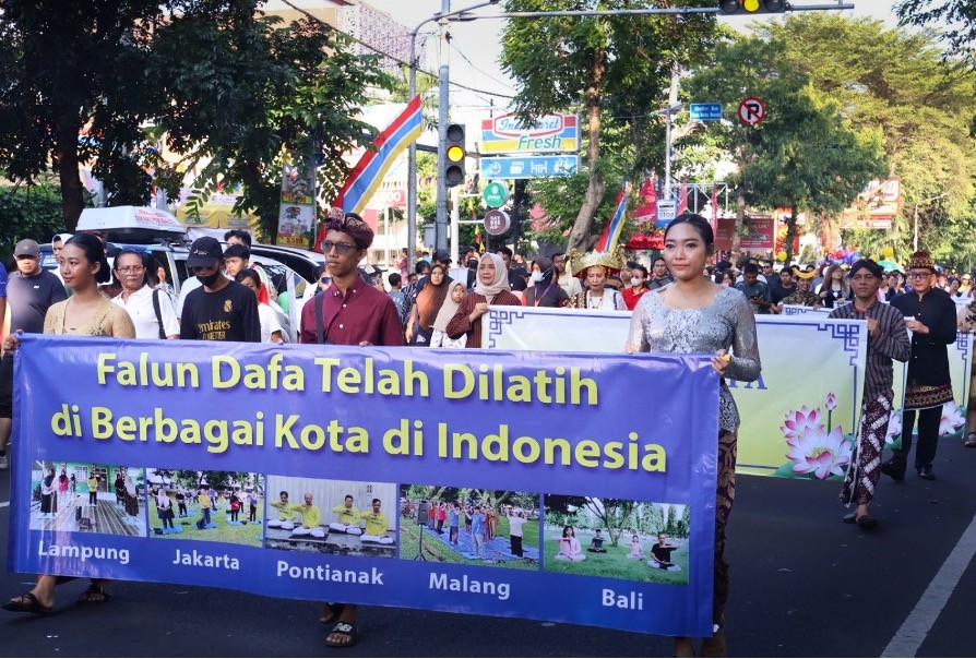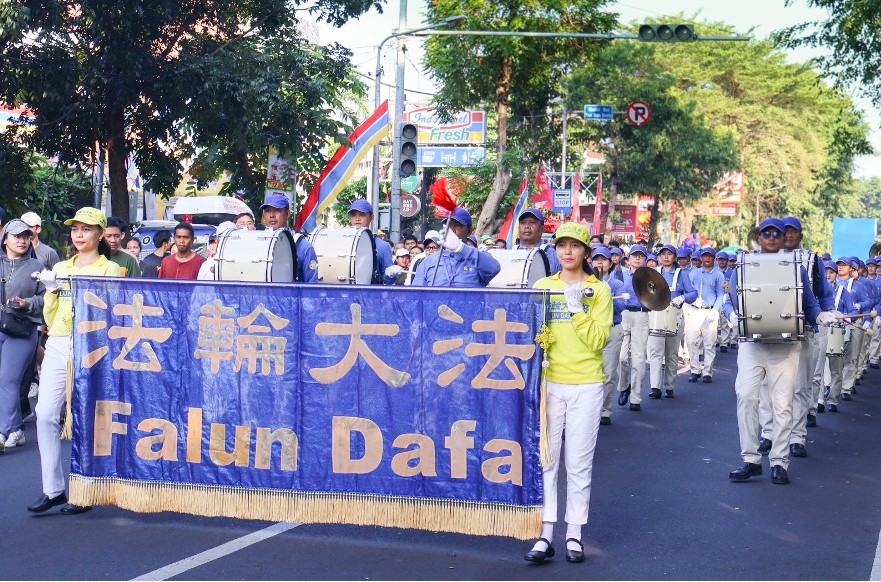 游行队伍多姿多彩,包括天国乐团、腰鼓队、仙女队,以及身穿印度尼西亚各地传统服饰的学员队伍。现场还展示了来自不同国家的法轮大法横幅和庆祝世界法轮大法日的标语。