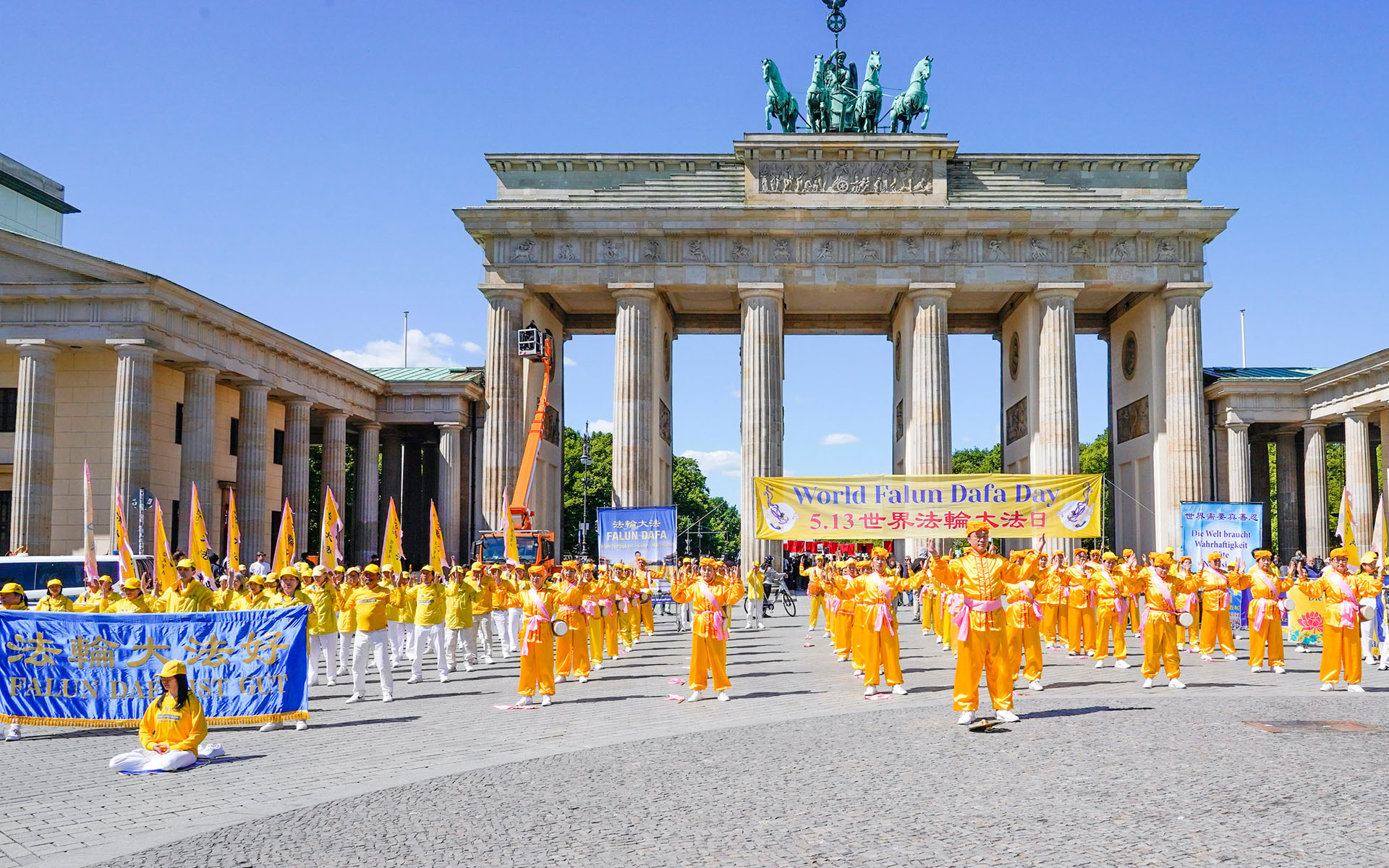 图1:二零二五年五月九~十日,德国法轮功学员连续两天在首都柏林举办大型活动,庆祝第二十六届世界法轮大法日暨师父华诞。图为五月九日在勃兰登堡门(Brandenburger Tor)前的活动。