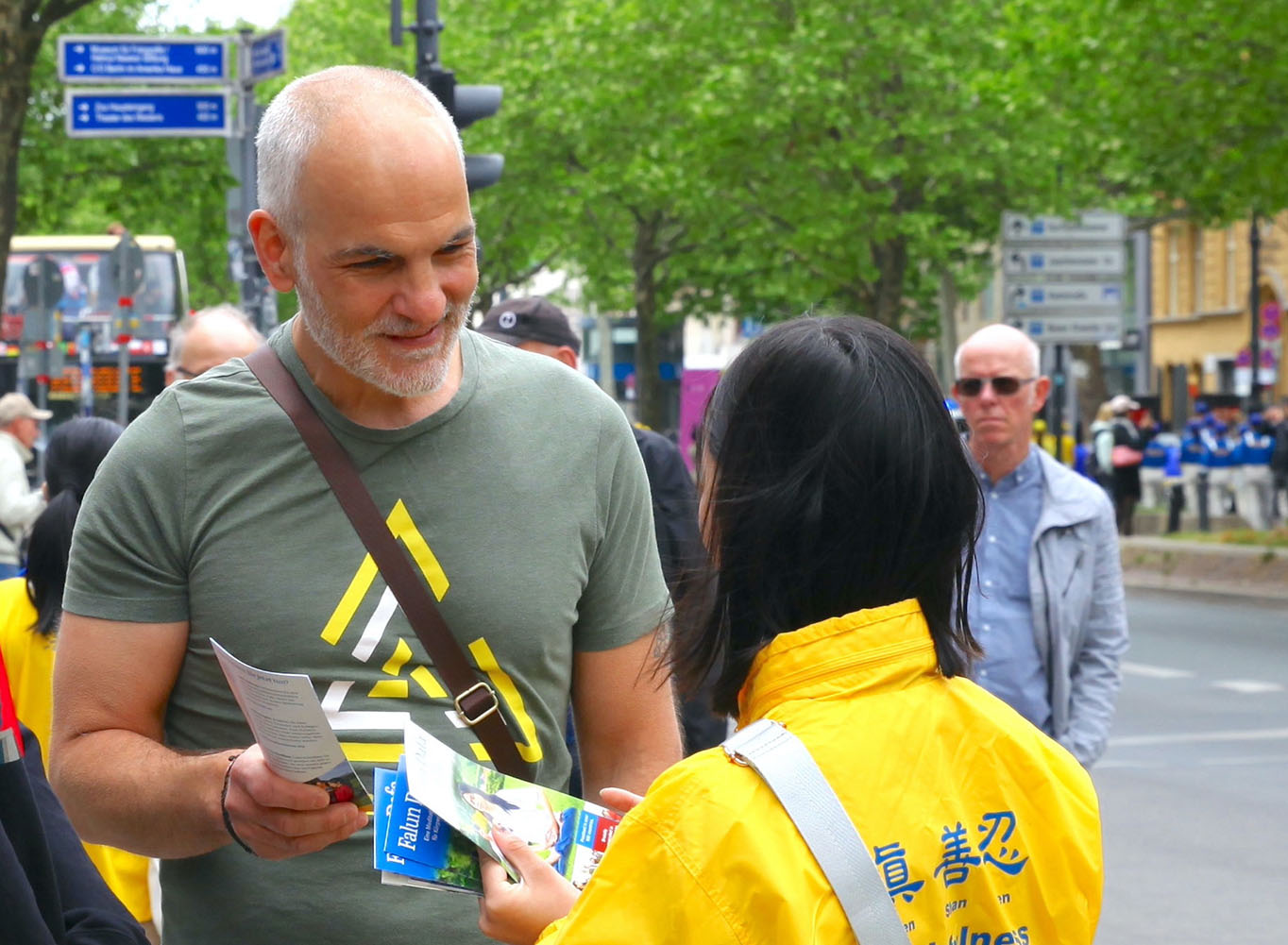 开篇提到的尼科先生(Nico)是柏林最大的百货公司财务总监,正在跑步运动的他遇到法轮功学员游行队伍,停下脚步,他接过法轮功学员递上的资料,并专注地观赏着游行活动。