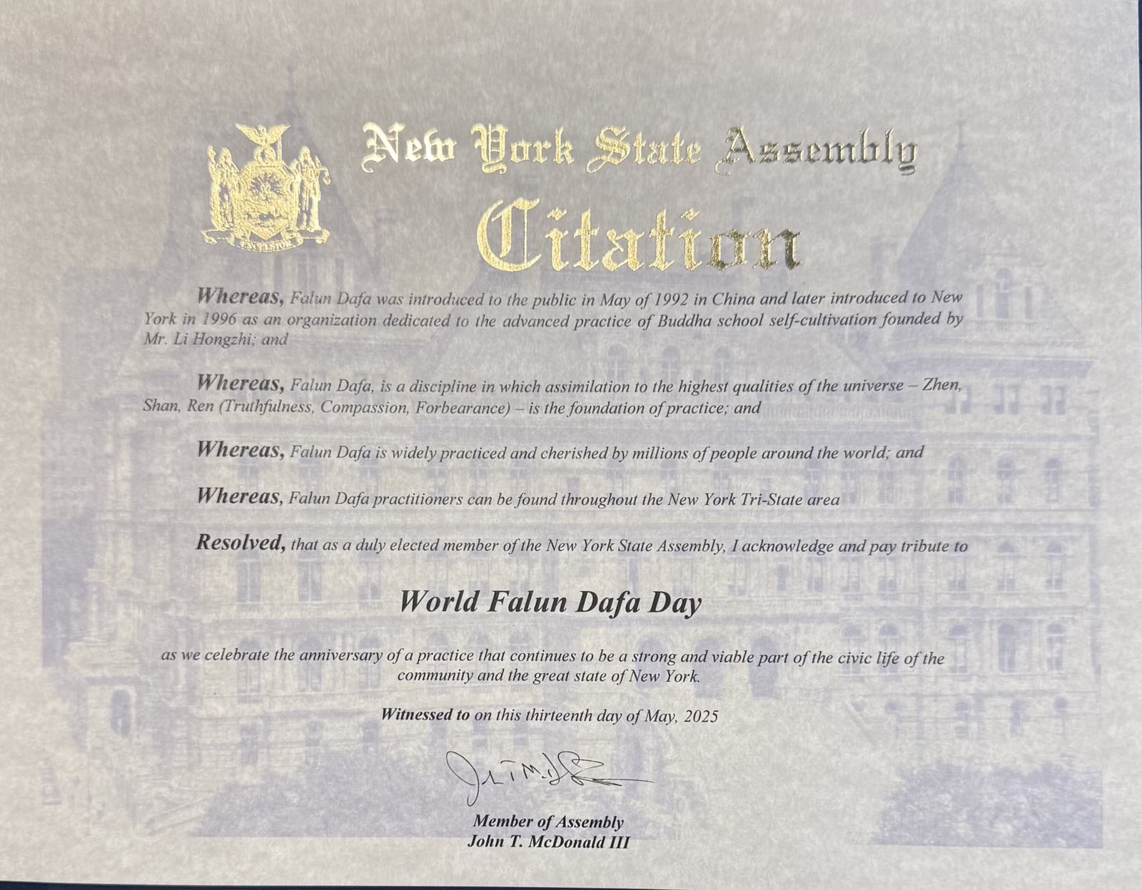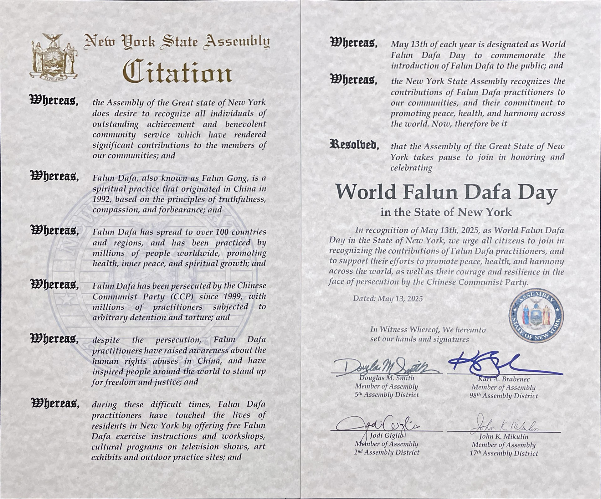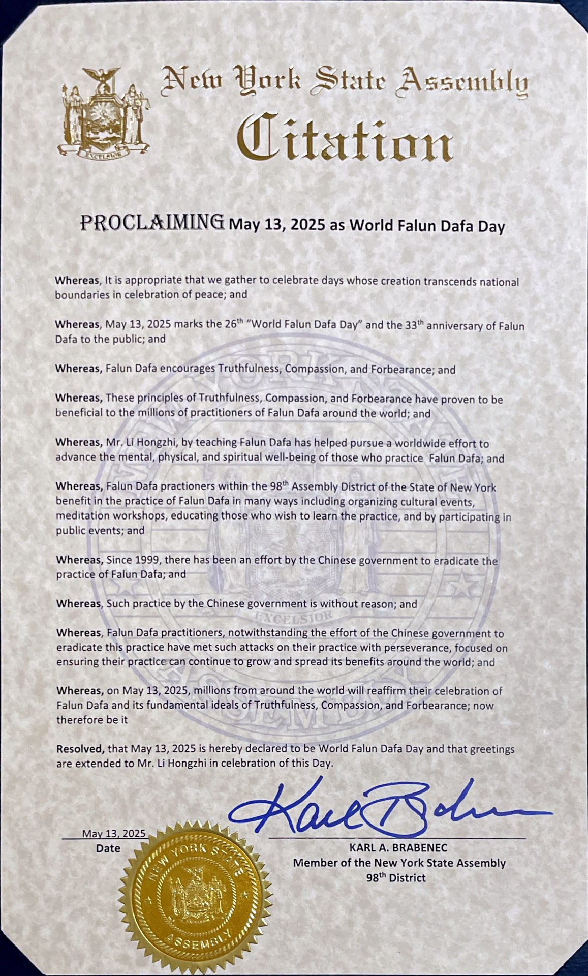纽约州四位众议员——州众议员道格拉斯‧史密斯(Douglas M. Smith,第五选区)、少数党党鞭卡尔‧布拉本尼克(Karl A. Brabenec,第九十八选区)、州众议员乔迪‧吉格里欧(Jodi Giglio,第二选区)和约翰‧米库林(John K. Mikulin,第十七选区)联名签发褒奖令,宣布二零二五年五月十三日为“纽约州世界法轮大法日”。
