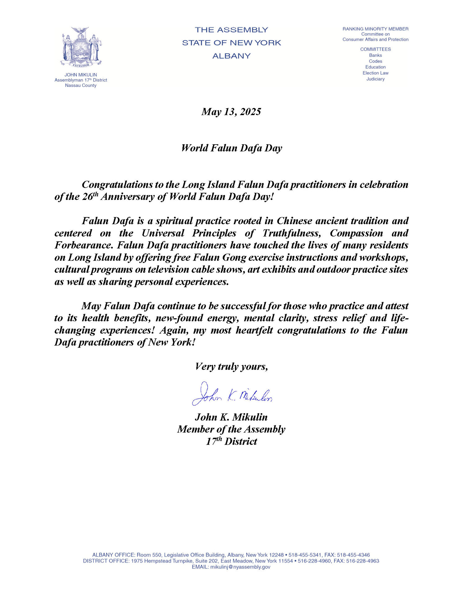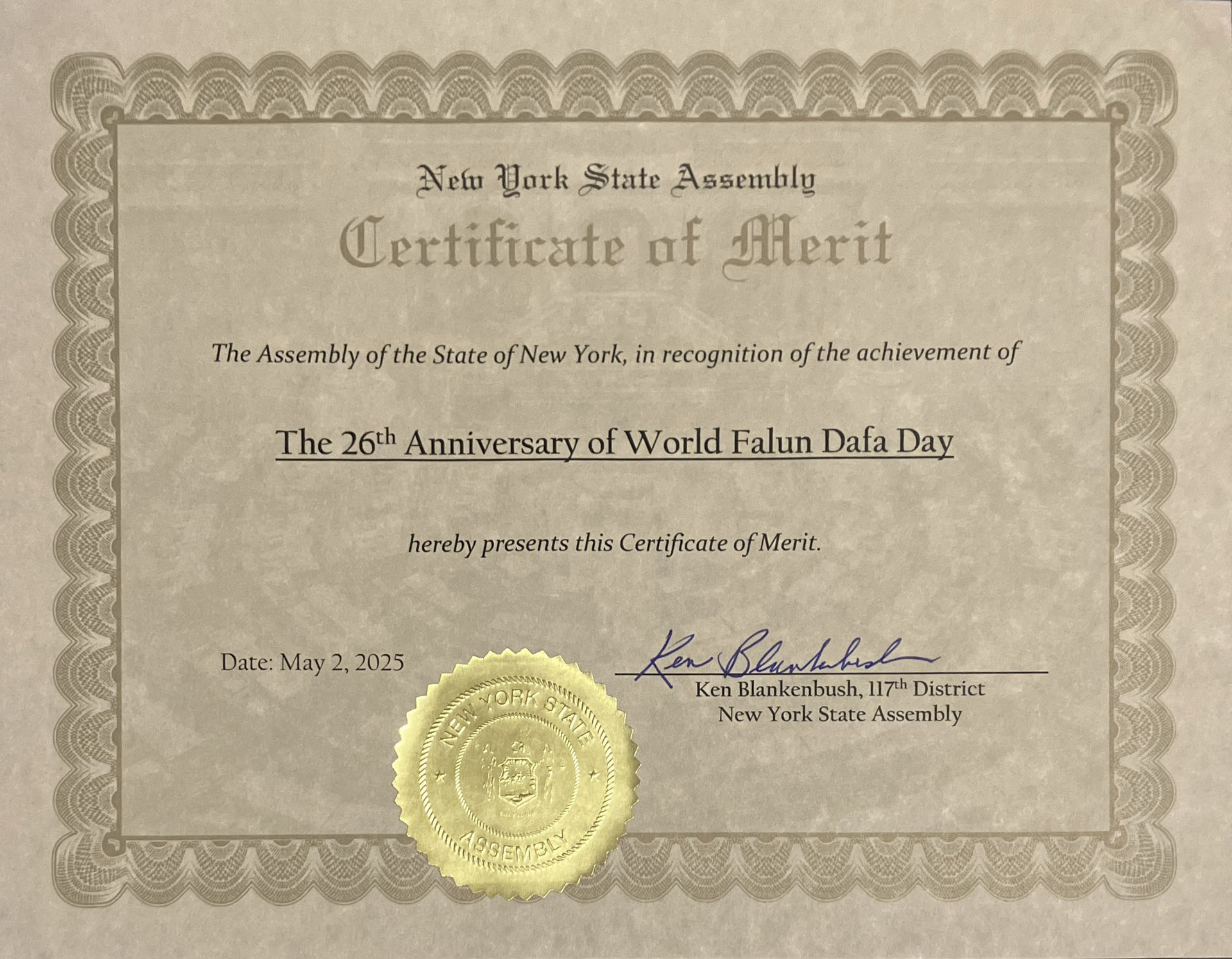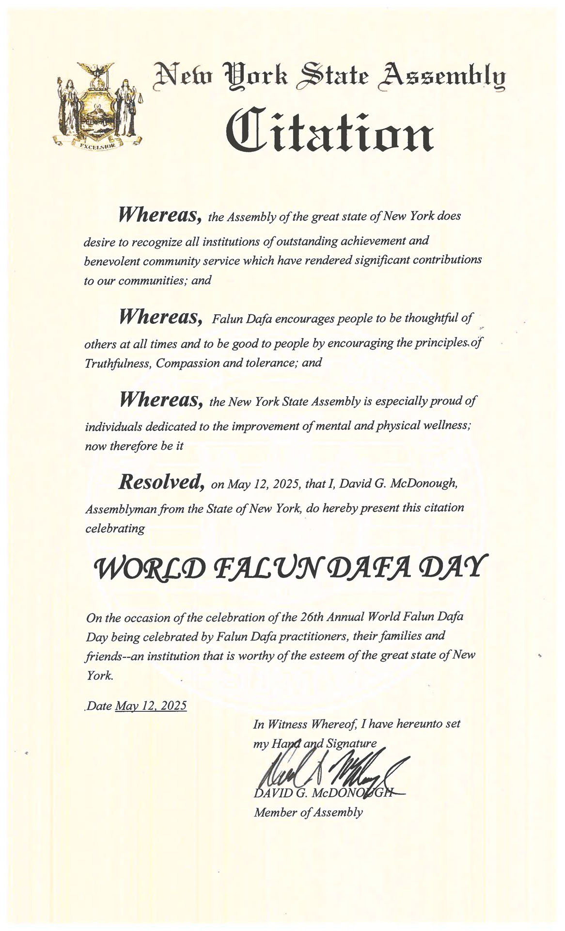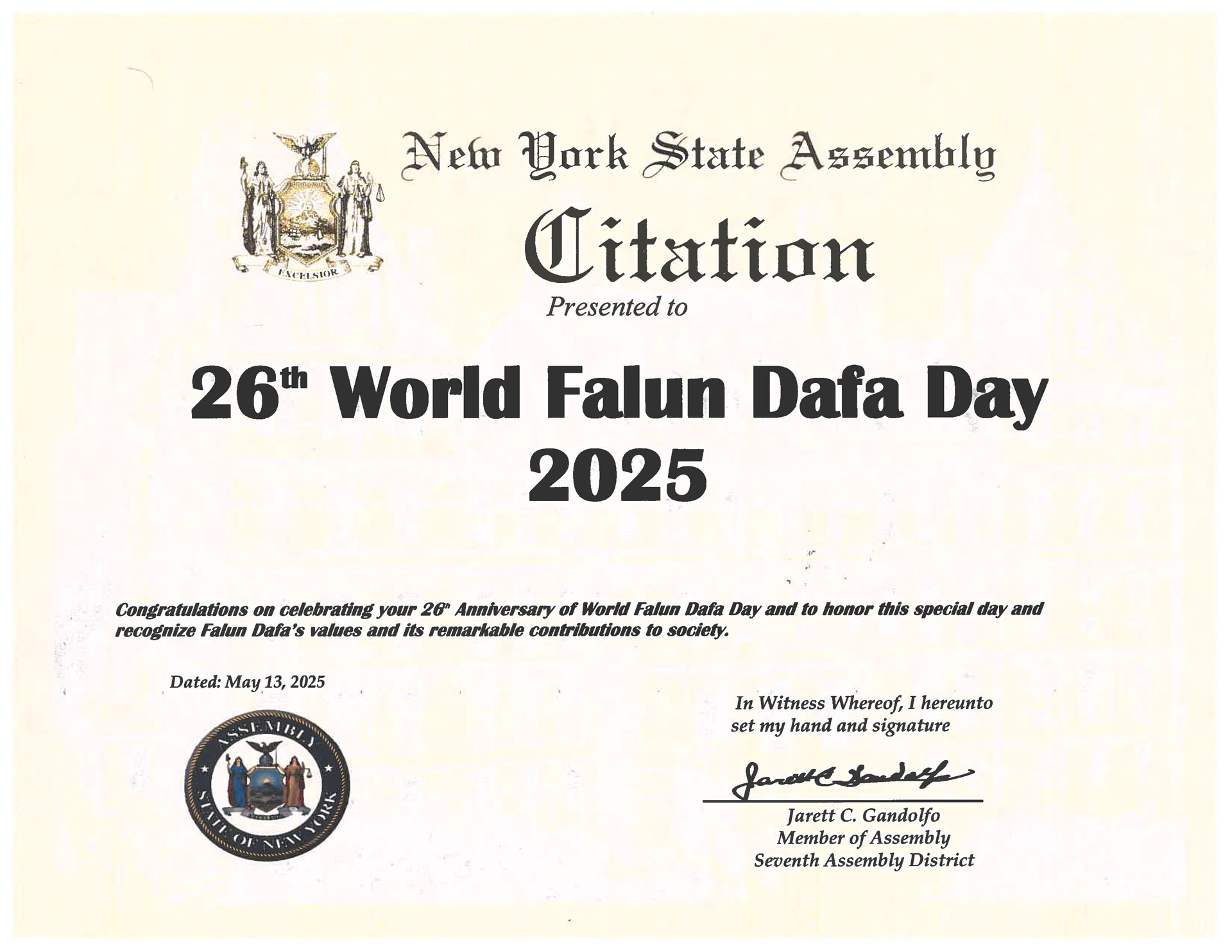 纽约州四位众议员——州众议员道格拉斯‧史密斯(Douglas M. Smith,第五选区)、少数党党鞭卡尔‧布拉本尼克(Karl A. Brabenec,第九十八选区)、州众议员乔迪‧吉格里欧(Jodi Giglio,第二选区)和约翰‧米库林(John K. Mikulin,第十七选区)联名签发褒奖令,宣布二零二五年五月十三日为“纽约州世界法轮大法日”。