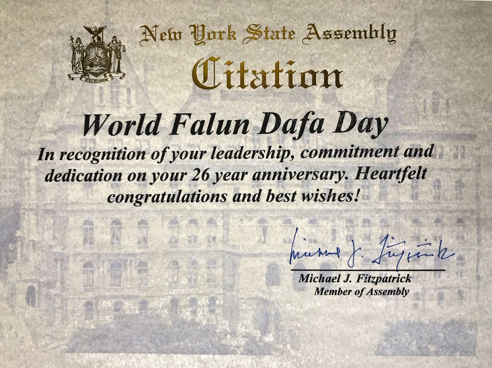 第八选区州众议员迈克尔‧菲茨帕特里克(Michael J. Fitzpatrick)代表纽约州议会嘉奖世界法轮大法日,他写道:“在二十六周年纪念日之际,表彰你们的领导力、责任感与奉献。谨致以衷心的祝贺与最诚挚的祝福!”
