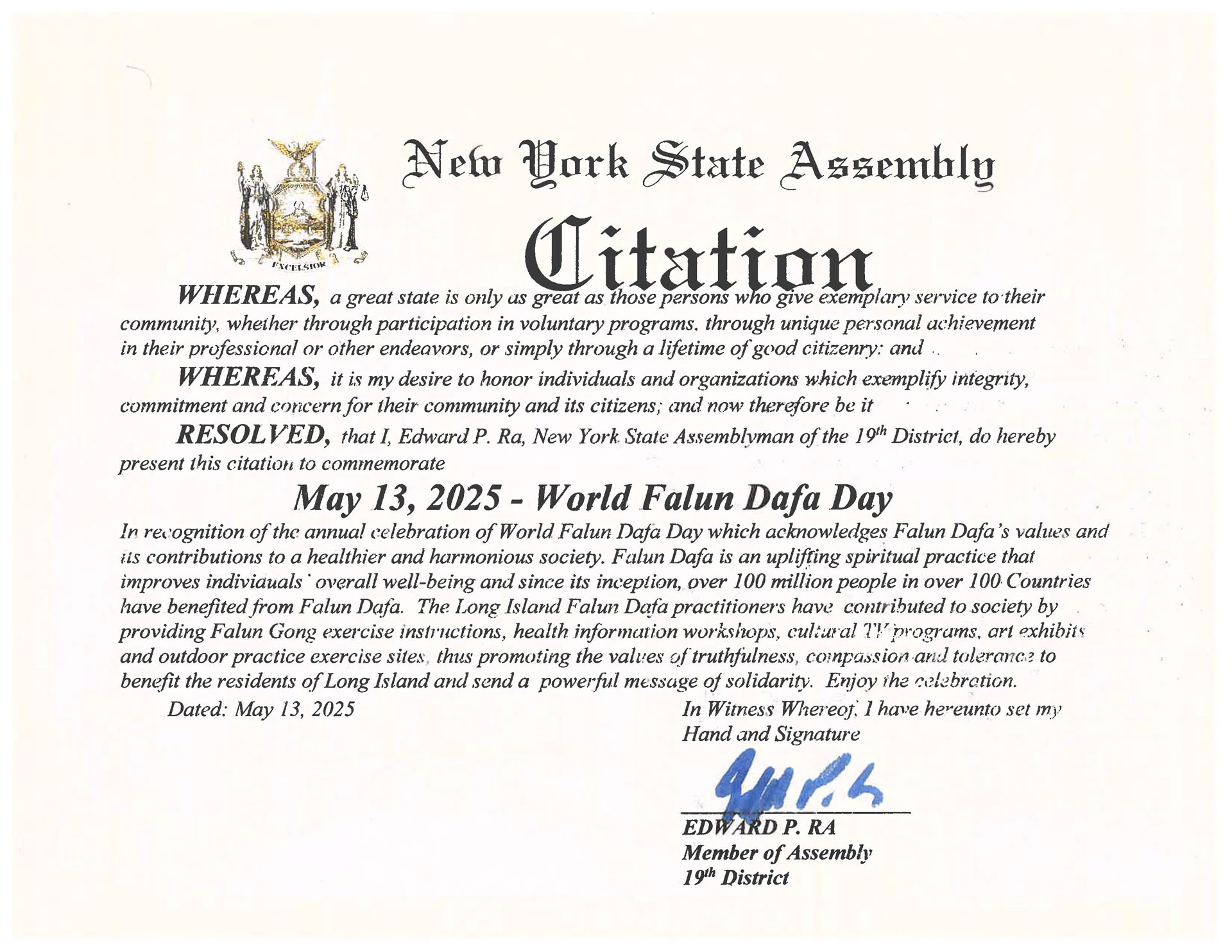 “每年的五月十三日被定为世界法轮大法日,这一天旨在纪念法轮大法向公众传出的时刻;同时,纽约州议会也表彰法轮大法修炼者对社区所做的贡献,并肯定他们在全球推广和平、健康与和睦的努力。” 褒奖令中说:“纽约州议会一同致敬,并庆祝世界法轮大法日。”