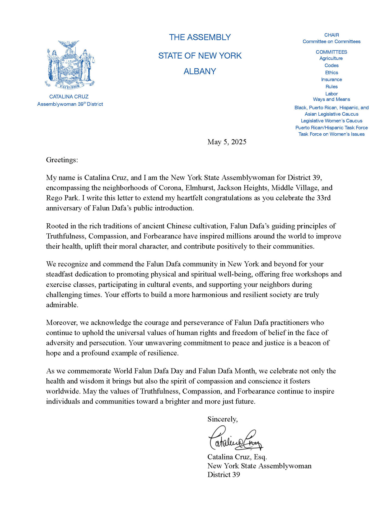 州众议院遴选委员会主席、第三十九选区州众议员卡塔琳娜‧克鲁兹(Catalina Cruz)致信,衷心祝贺法轮大法公开传出三十三周年。