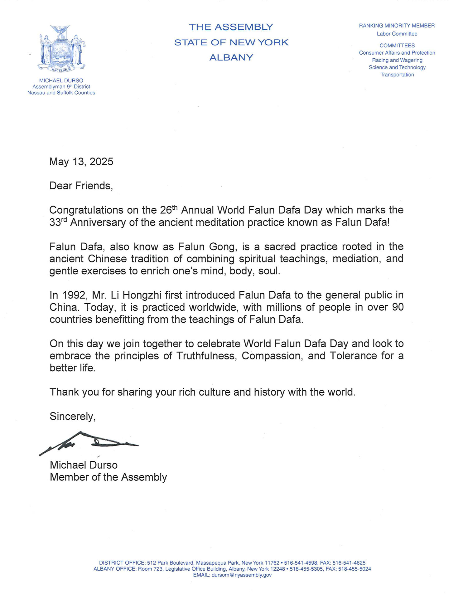 “法轮大法修炼以同化宇宙最高特性真、善、忍为根本,广为全世界数以百万计的人们修炼并珍惜,其修炼者遍布纽约三州地区。”他表示,“有鉴于此,我作为纽约州众议员民选议员,表彰并致敬世界法轮大法日;这门修炼持续在本社区乃至伟大纽约州公民生活中展现强大生机。”