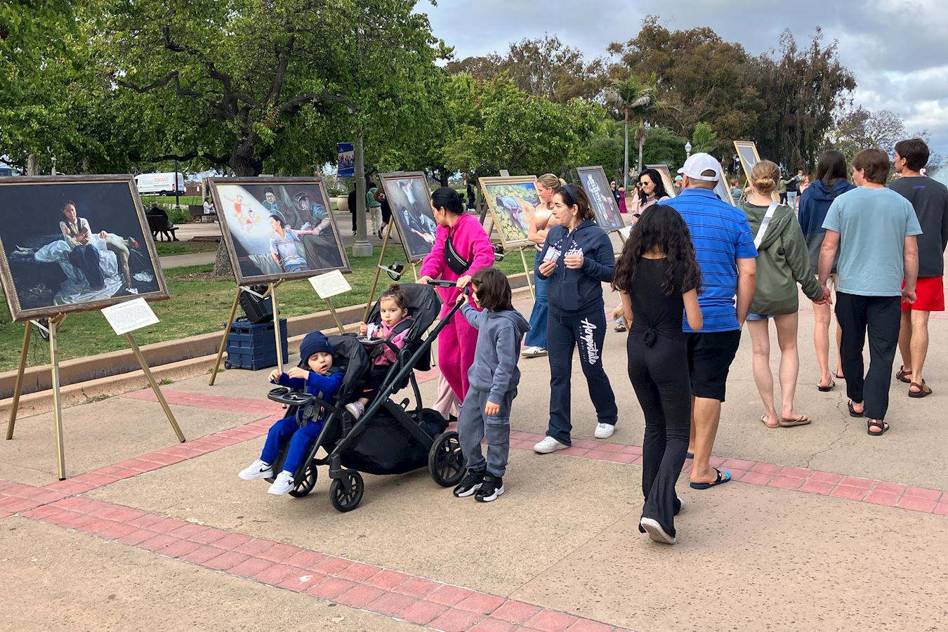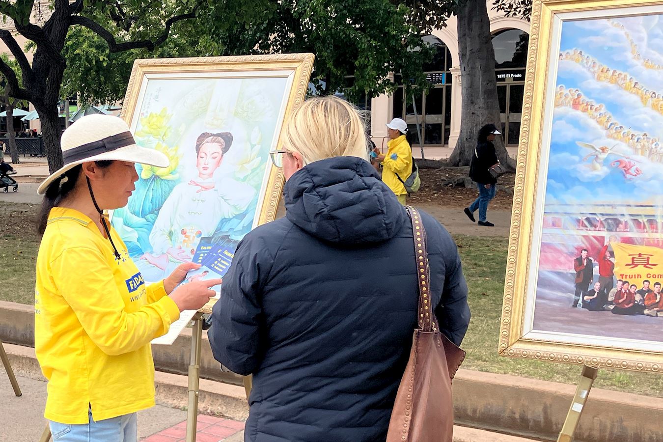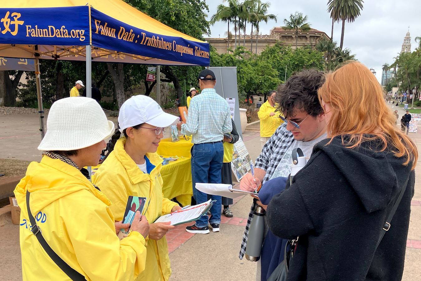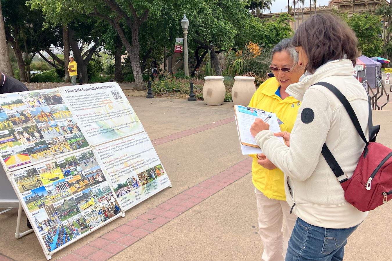 图1:二零二五年五月十七,加州圣地亚哥法轮功学员在当地著名景点巴博亚公园再次举办真善忍画展,并为美国参议院发起的《法轮功保护案》征签。