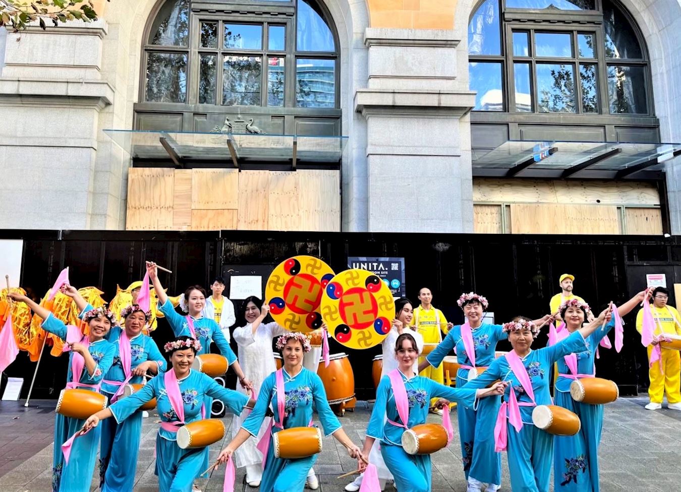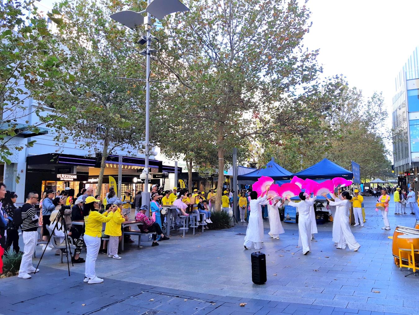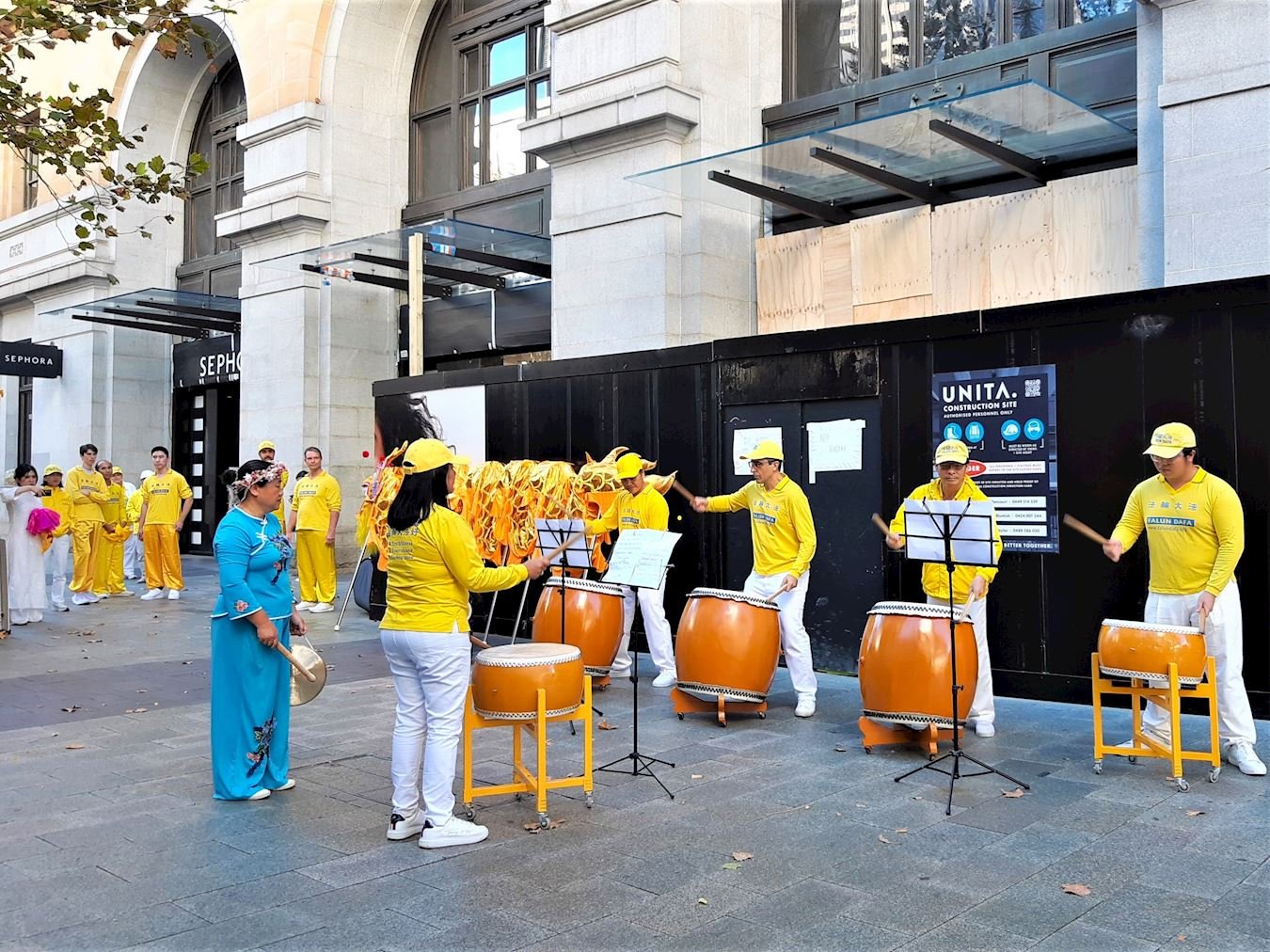 法轮功学员的表演以大气磅礴、铿锵有力的鼓乐开场。令过往行人停下脚步,纷纷拍照或录像。学员们接着表演了扇子舞、舞龙和腰鼓舞。精彩的表演赢来观众阵阵掌声和喝彩。
