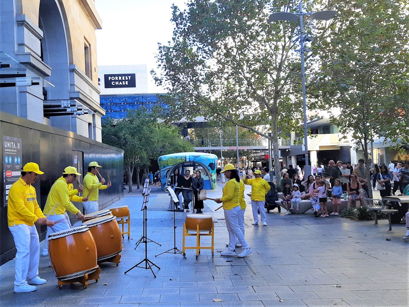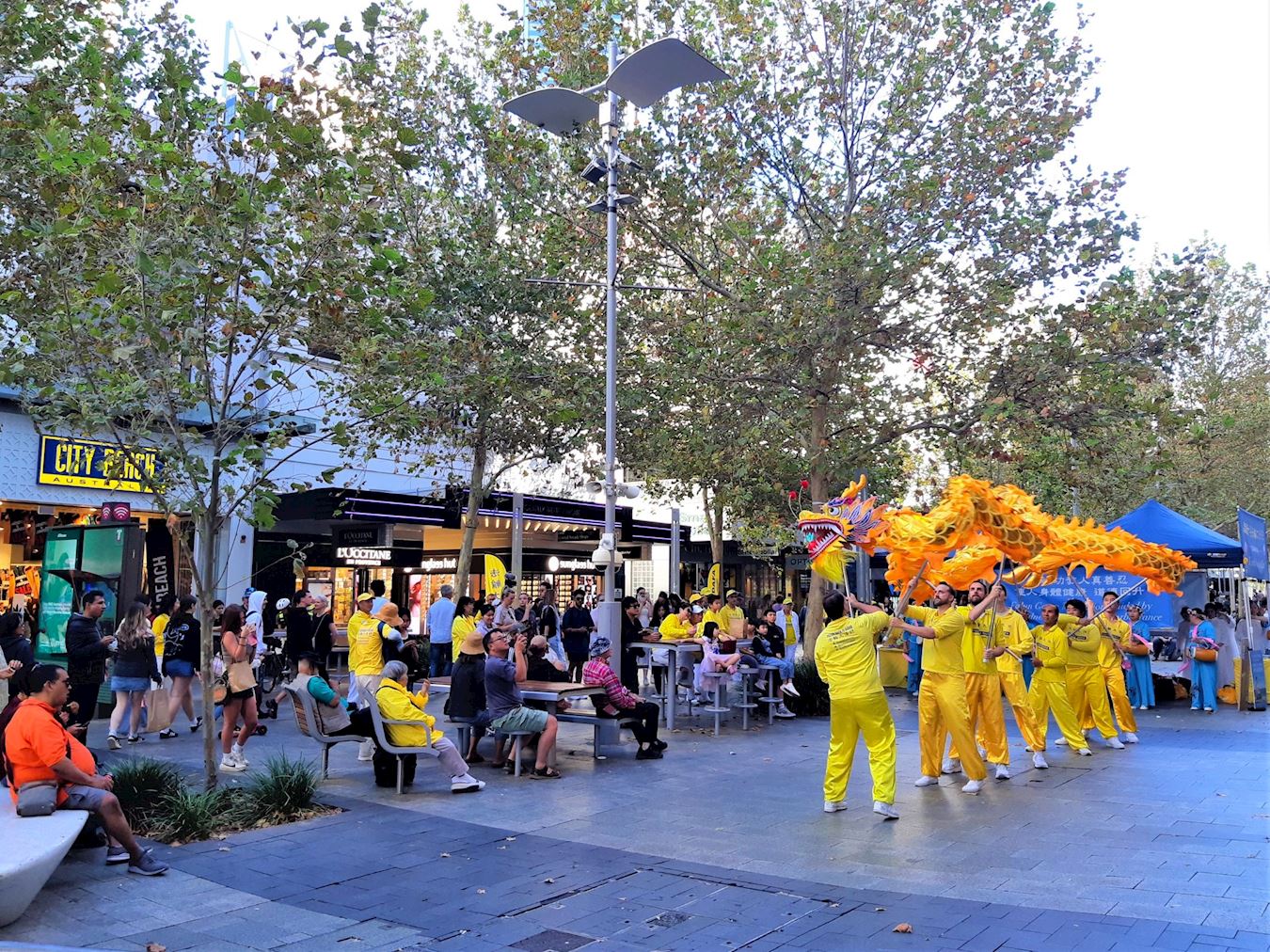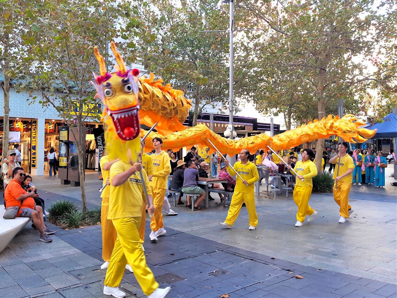 法轮功学员的表演以大气磅礴、铿锵有力的鼓乐开场。令过往行人停下脚步,纷纷拍照或录像。学员们接着表演了扇子舞、舞龙和腰鼓舞。精彩的表演赢来观众阵阵掌声和喝彩。