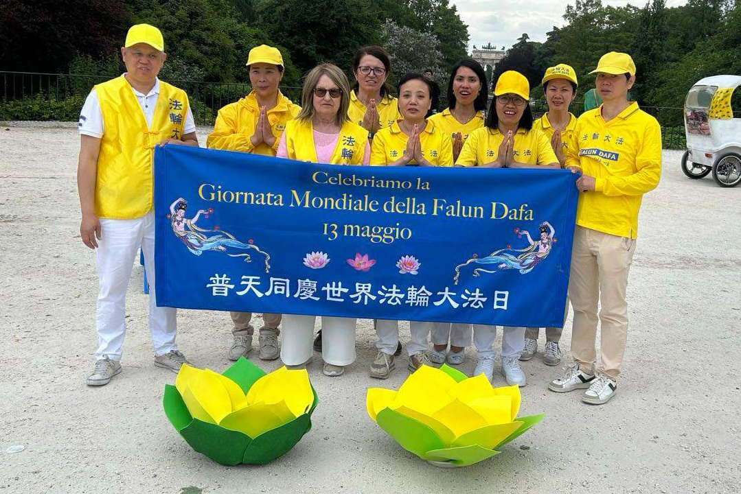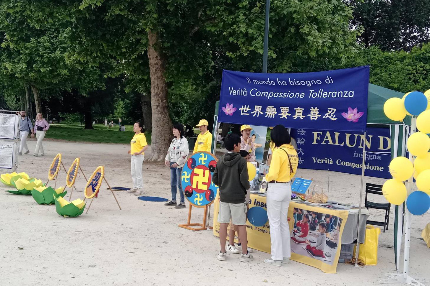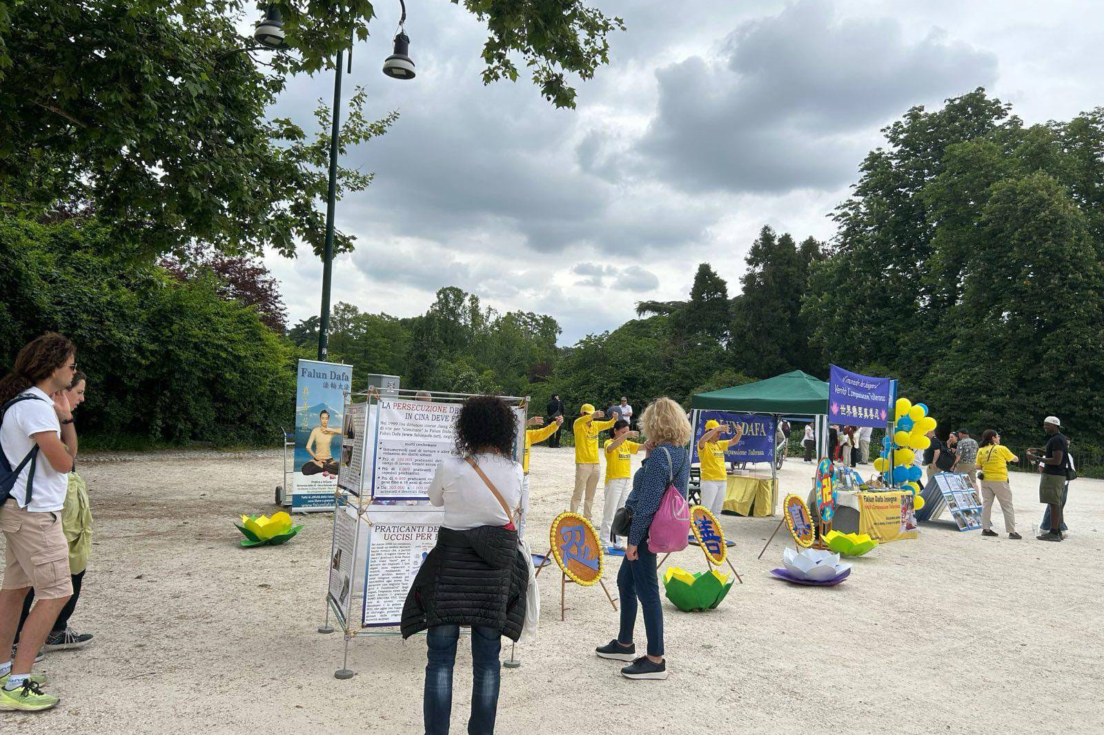 二零二五年五月四日,米兰法轮功学员在米兰城堡附近的森皮奥内公园(Parco Sempione)举办了世界法轮大法日庆祝活动。