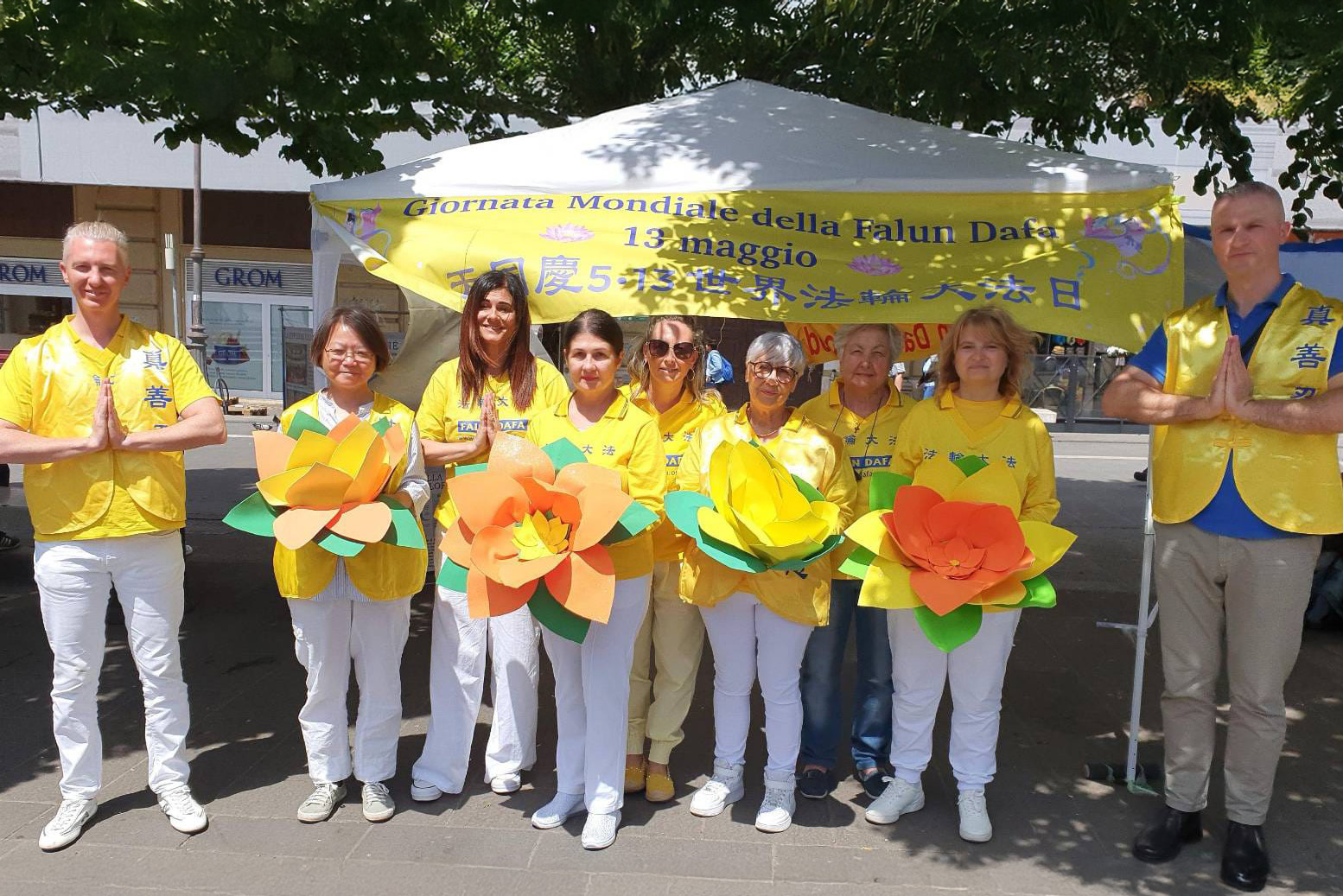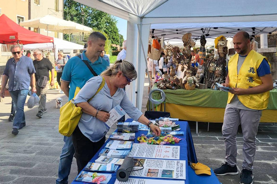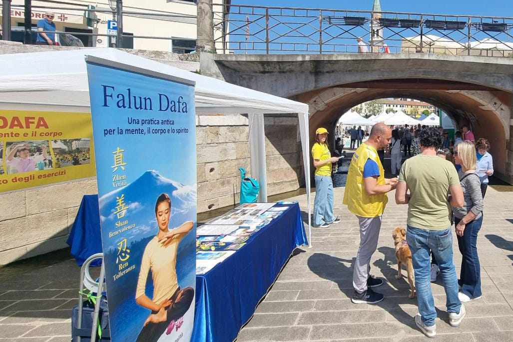 五月一日,威尼斯地区的大法学员在都娄(Dolo)小镇参加了一场社区活动(Dolo in fiore),向市民展示法轮大法的美好,庆祝5.13世界法轮大法日。