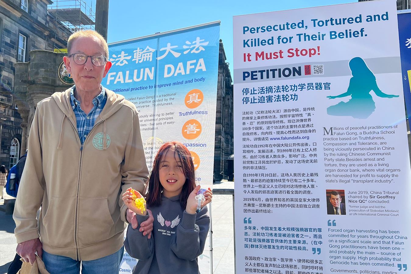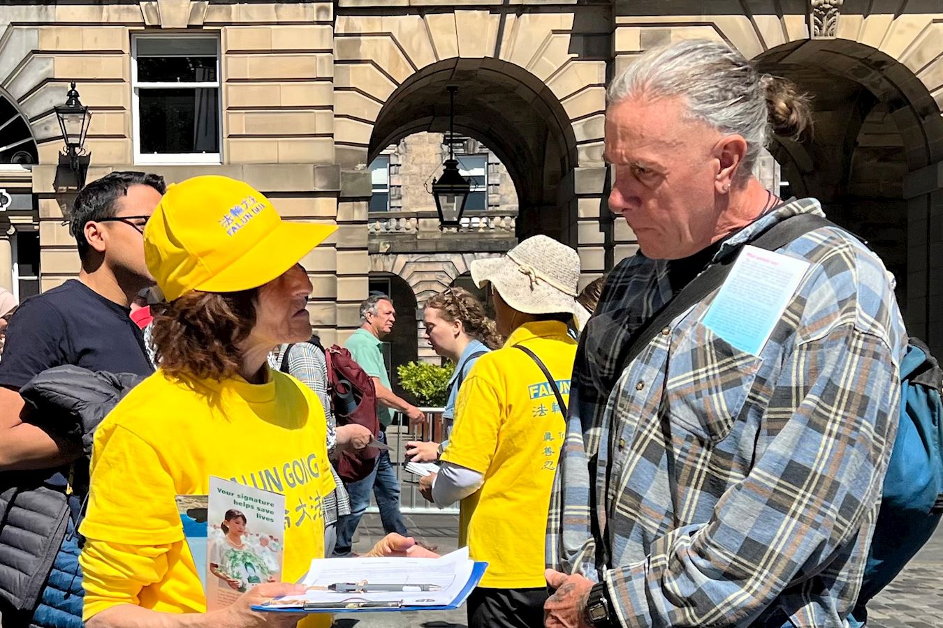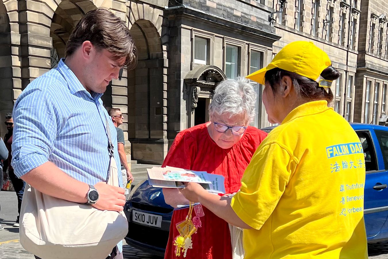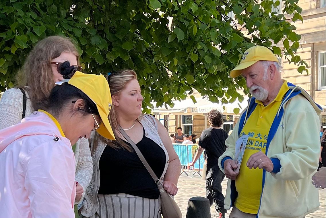值得一提的是,活动当天,正是苏格兰教会年度大会开幕日,召开会议的市政厅,正对着学员的弘法点,两辆载着参会长老的汽车缓缓从市政厅驶出,他们注目着学员的炼功场面和真相展板,他们看到这群人正为中国大陆民众争取信仰自由而努力。
