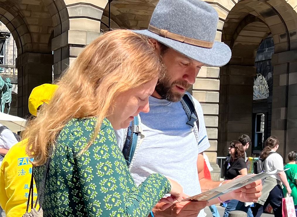 一位二十多岁、肤色黝黑、带着美国口音的男青年,拿着法轮功简介传单,询问当地义务教功班的地点和联系方式。他说:“我会和住在爱丁堡的父亲一起去学功。”