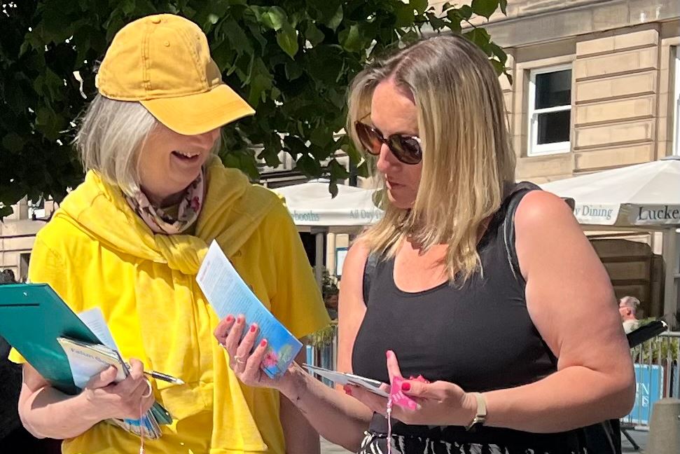 一位五十多岁英国女士经过展位时,感受到了功法带有很强的能量,她拿起传单认真阅读,立即被深深吸引,根本不理会已经走远的丈夫。她向学员询问了很多关于大法的信息,离开时,学员赠送她一个写有法轮大法好、真善忍好的真相小莲花。