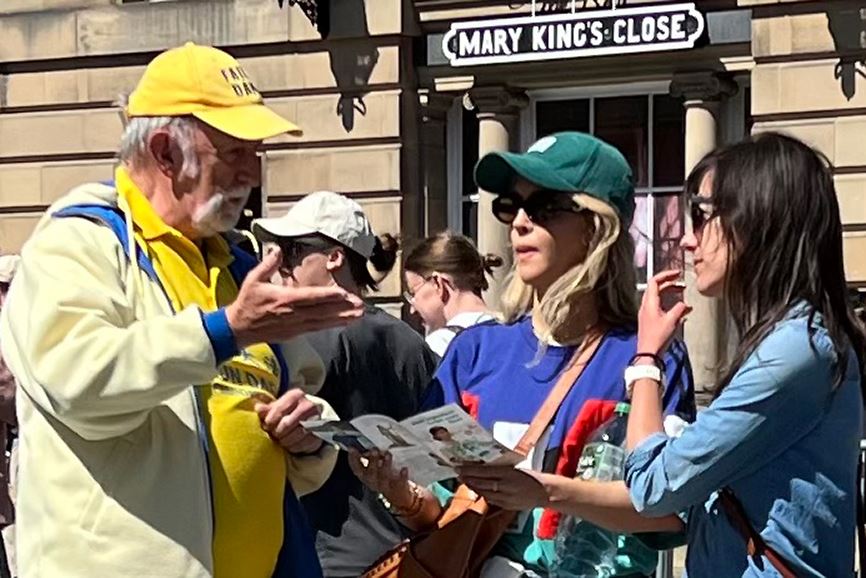 二零二五年五月十七日,为庆祝第二十六届世界法轮大法日,苏格兰及北英格兰的部分法轮功学员相聚苏格兰首府爱丁堡,在著名的王家一英里大街举办活动,向民众介绍法轮大法弘传世界三十三周年、为世界各民族上亿修炼者带来福祉的盛况,并恭祝法轮功创始人李洪志师父生日快乐。