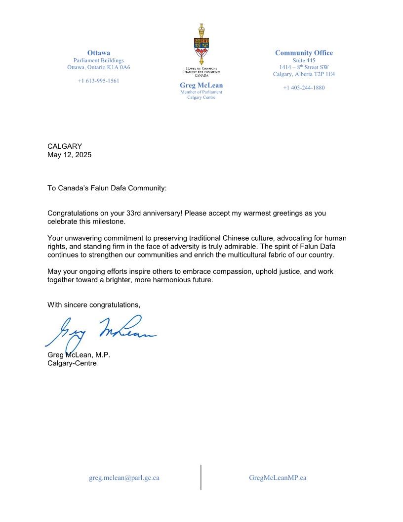 卡尔加里中心选区国会议员麦克莱恩(Greg McLean)的贺信中提到:“祝贺法轮大法弘传三十三周年,值此里程碑之际,请接受我最诚挚的问候。”