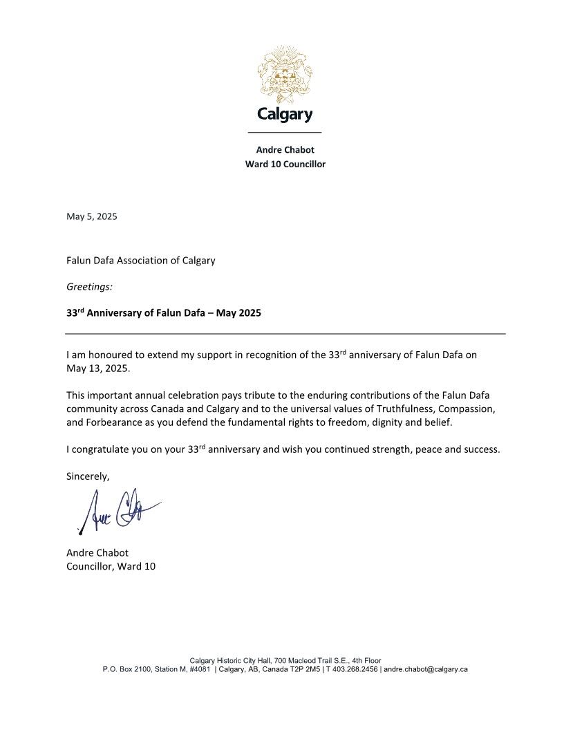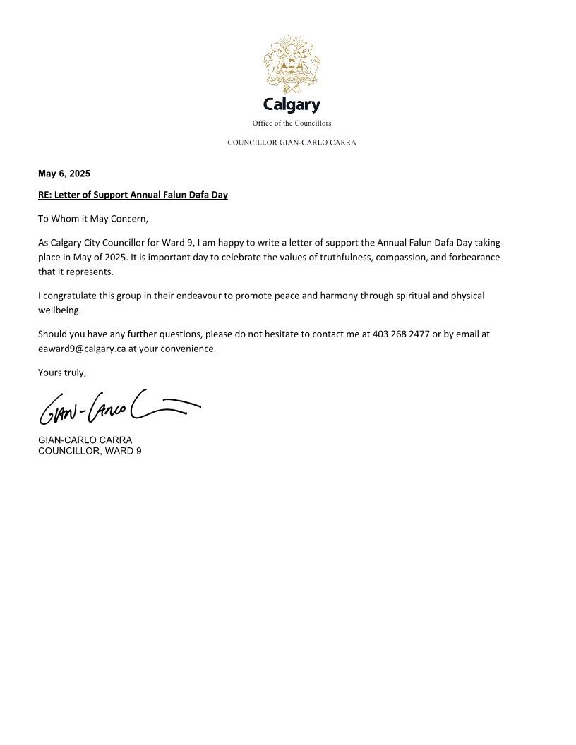 卡尔加里第九选区市议员卡拉(Gian-Carlo Carra)表示,“很高兴写信支持2025年5月举行的年度法轮大法日活动。这是庆祝法轮大法所代表的‘真、善、忍’价值观的重要日子。”他感谢法轮大法团体“通过身心健康促进安乐与谐和的努力”。