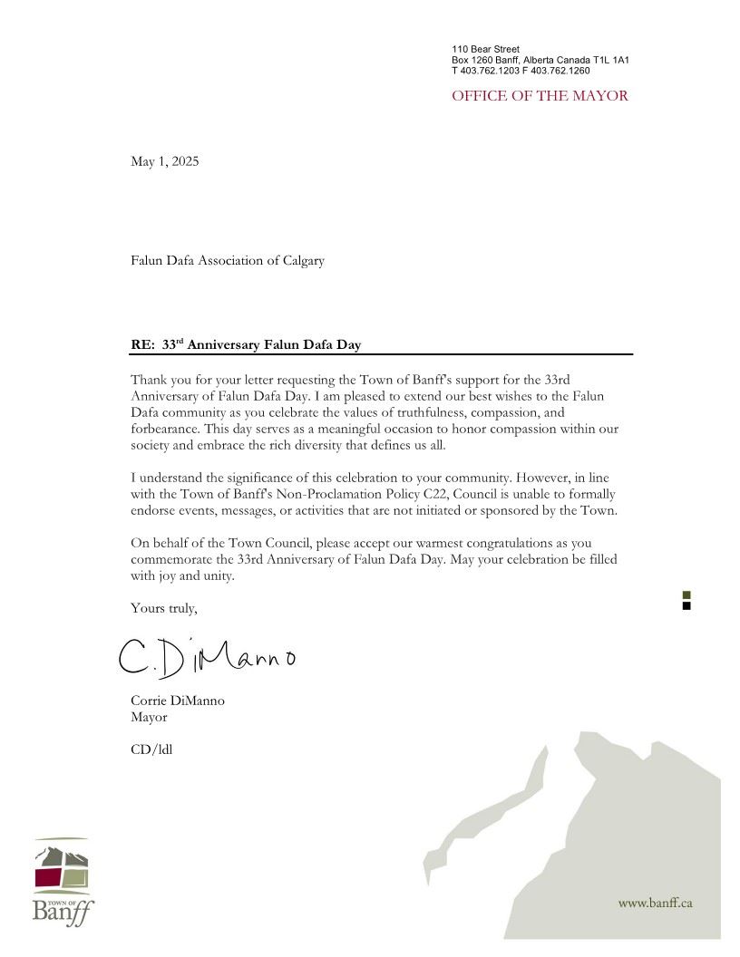 班芙镇镇长迪曼诺(Corrie DiManno)向法轮大法学员“致以最诚挚的祝福、最热烈的祝贺”。她表示,“这是一个意义非凡的日子,让我们弘扬良善,拥抱我们丰富的多元性。”