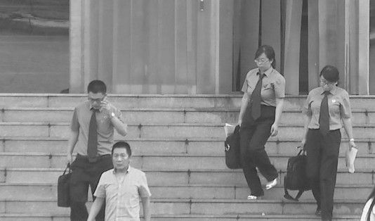 '二零一五年六月十九日,三河市法院对王占青等四位法轮功学员非法庭审结束后,毕立恒带领公诉人芮爽、申倩芳和检方书记员王朝阳从法院大楼走出来。'