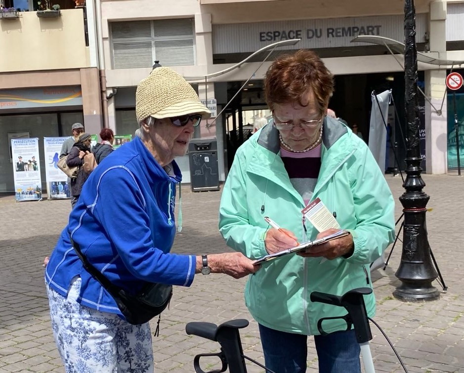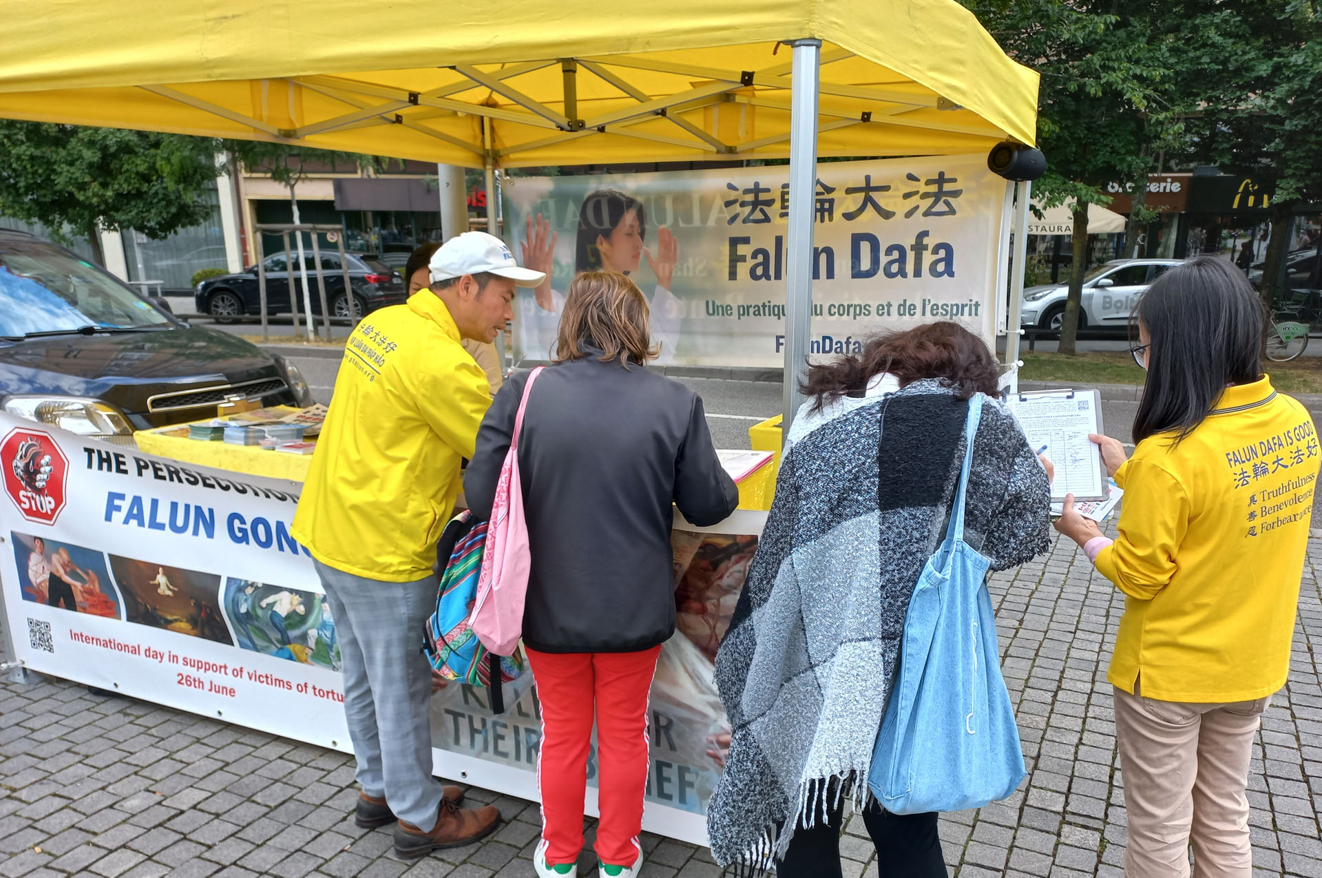 图1:五月二十五日,在斯特拉斯堡火车站广场上法轮功信息日,人们签名制止中共迫害法轮功。