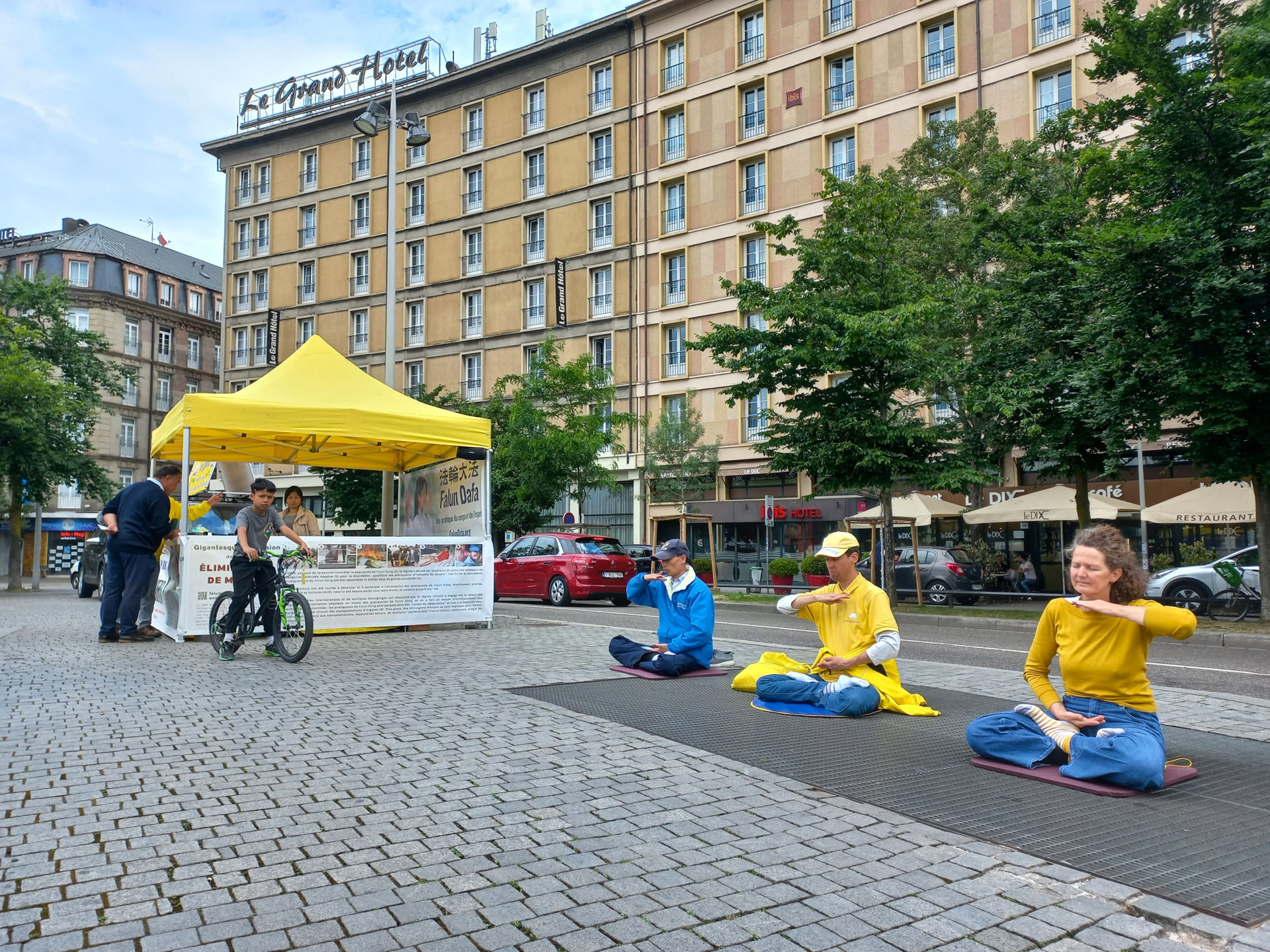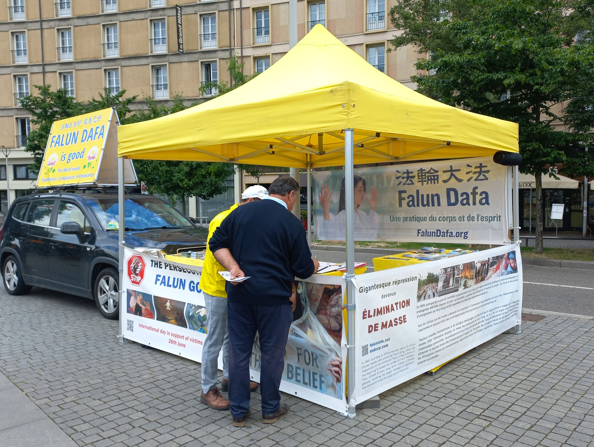 五月二十五日星期日,法轮功学员在斯特拉斯堡火车站广场举办了法轮功信息日。广场上悬挂了横幅,摆放了展板,展示有关法轮功修炼及法轮功学员在中国遭受迫害的图片和资讯。由于活动位于市中心和火车站之间,吸引了许多过路的民众前来观望。
