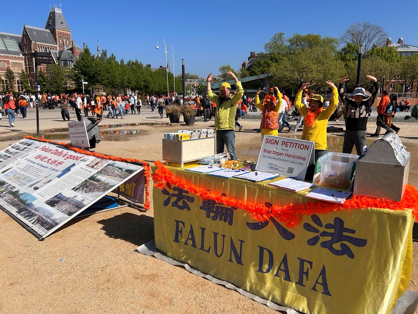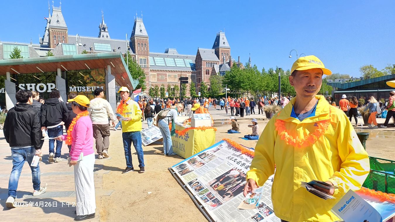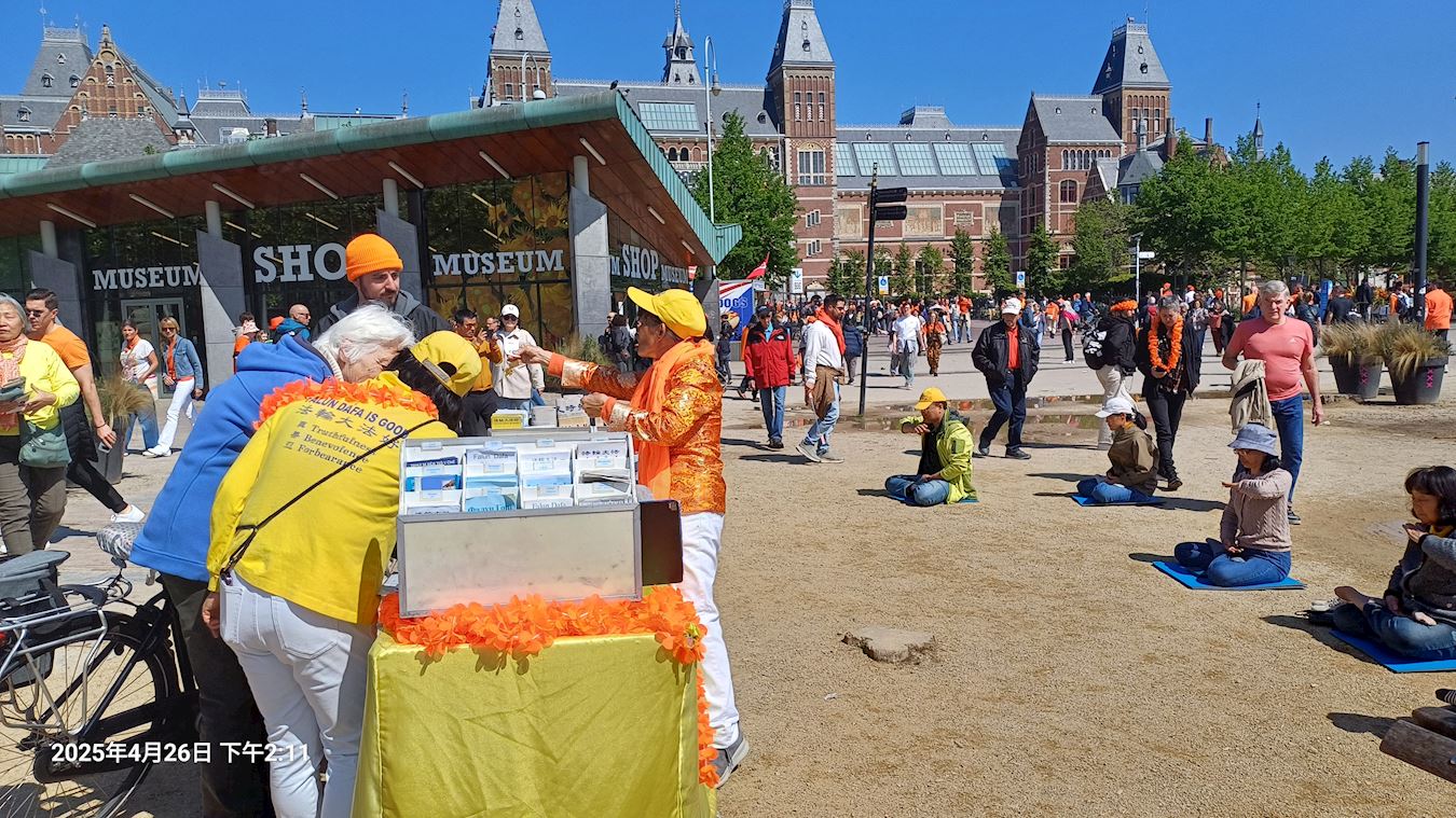 二零二五年的荷兰国王节定在了四月二十六日,这一天,在阿姆斯特丹市国立博物馆门前的广场上,民众欣喜的发现了法轮功学员的真相展位。法轮功学员的展位分为三部分,第一部分是法轮大法自一九九二年在中国弘传、受到褒奖的盛况及法轮功的功理介绍;第二部分是一九九九年至今法轮功被中国共产党镇压迫害“天安门自焚”伪案揭秘及法轮功学员被迫害的实证;第三部分是法轮功学员现场演示功法。