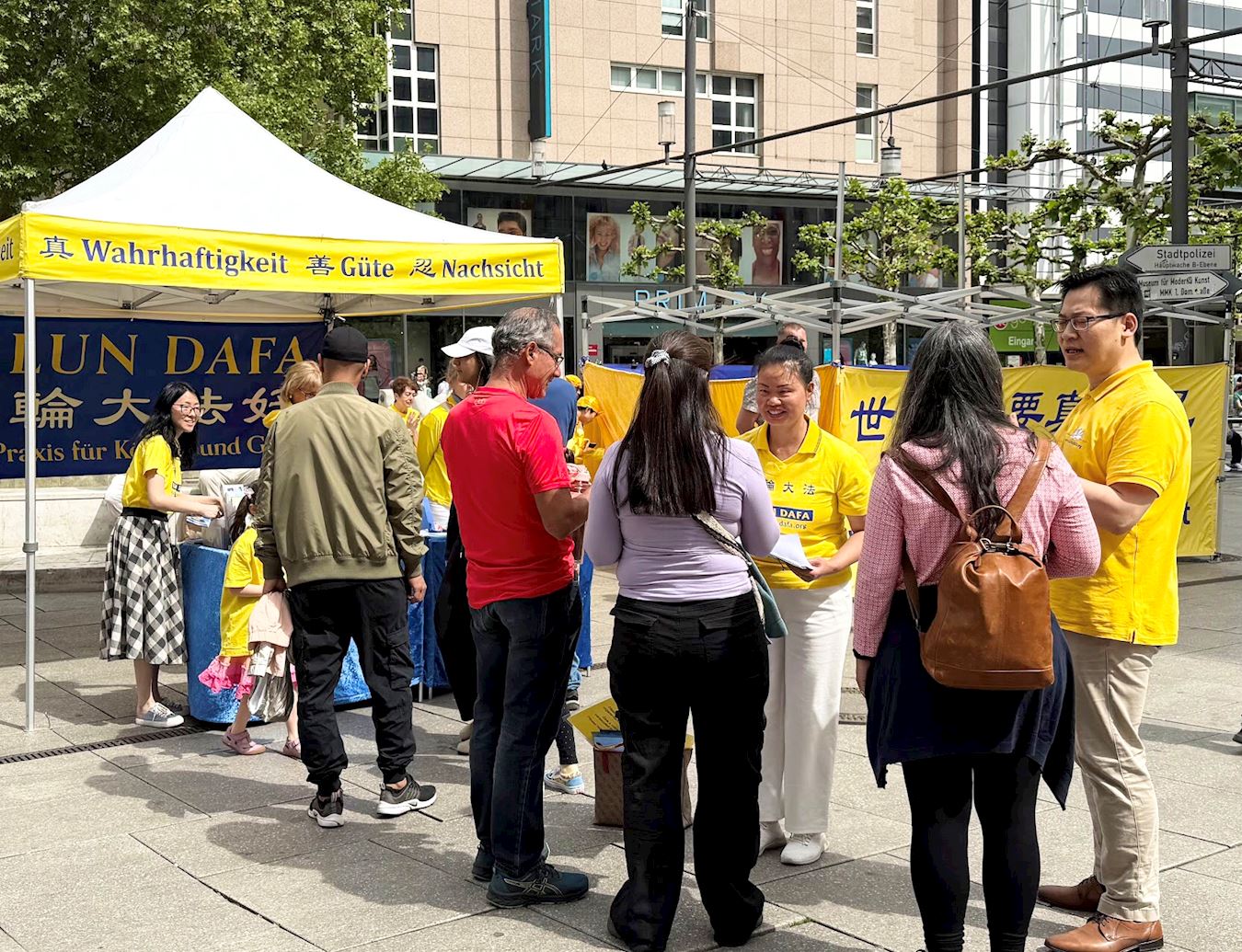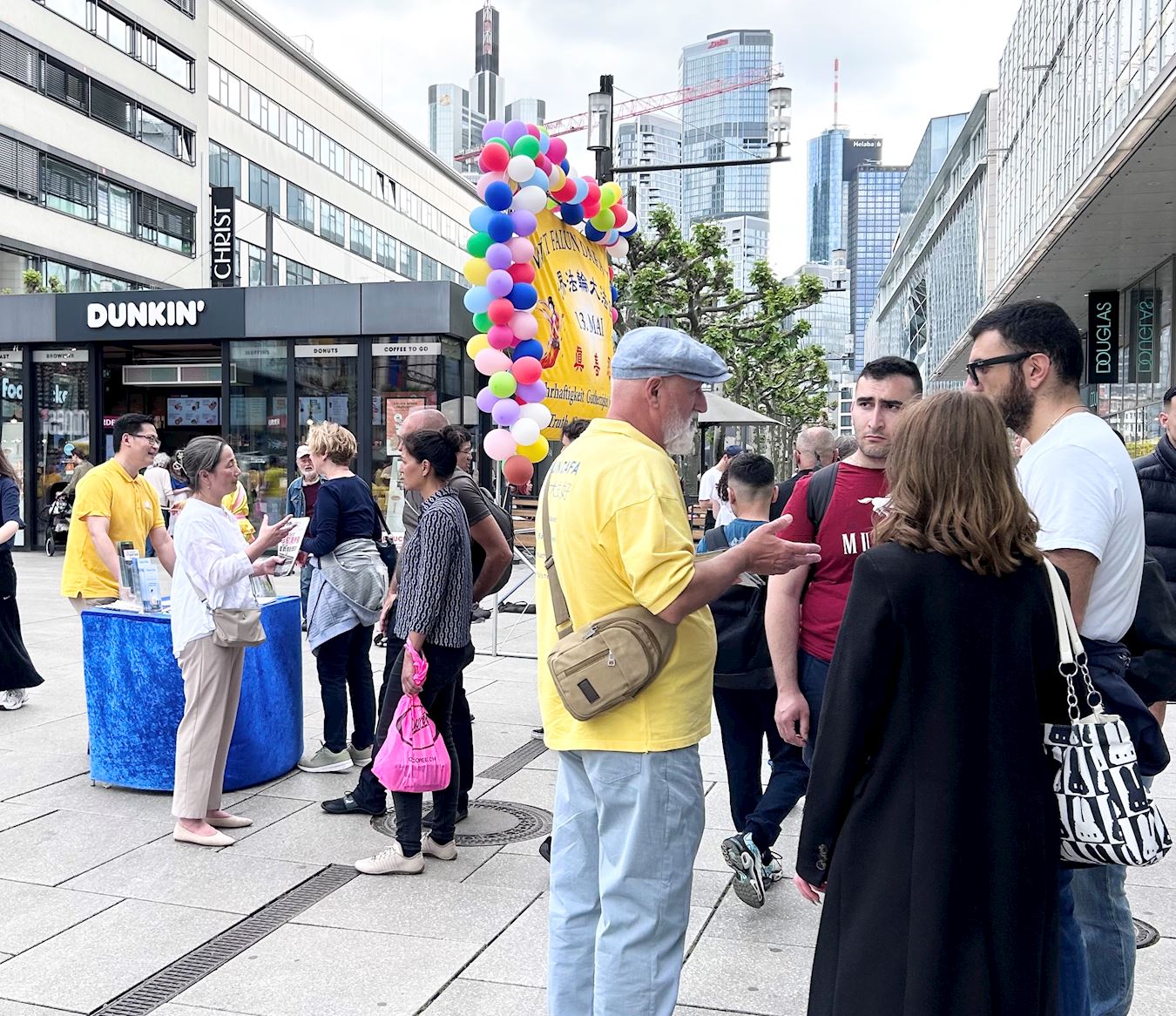 二零二五年五月三日,法轮功学员在德国金融中心法兰克福采尔大街(Zeil)举办大型集会活动,庆祝第二十六届世界法轮大法日和法轮大法弘传世界三十三周年,恭祝法轮功创始人李洪志师尊华诞。德国黑森州四位政要发来贺信支持。