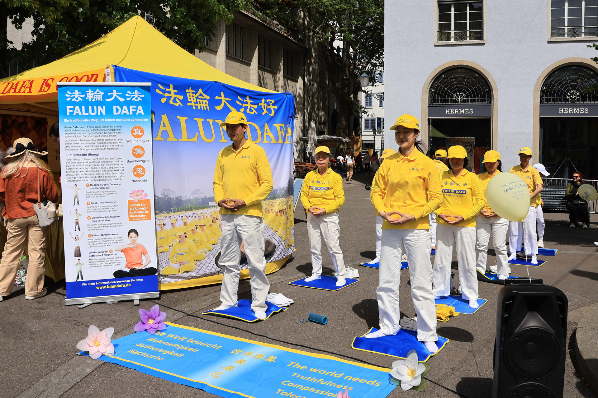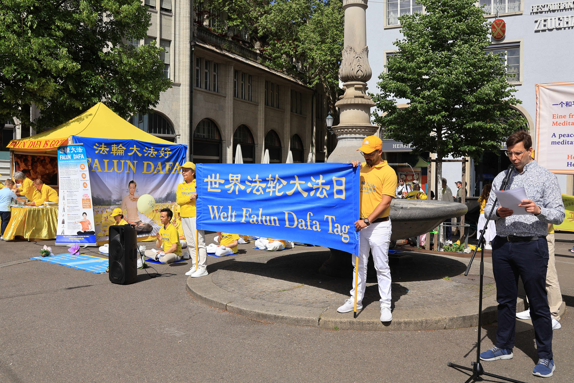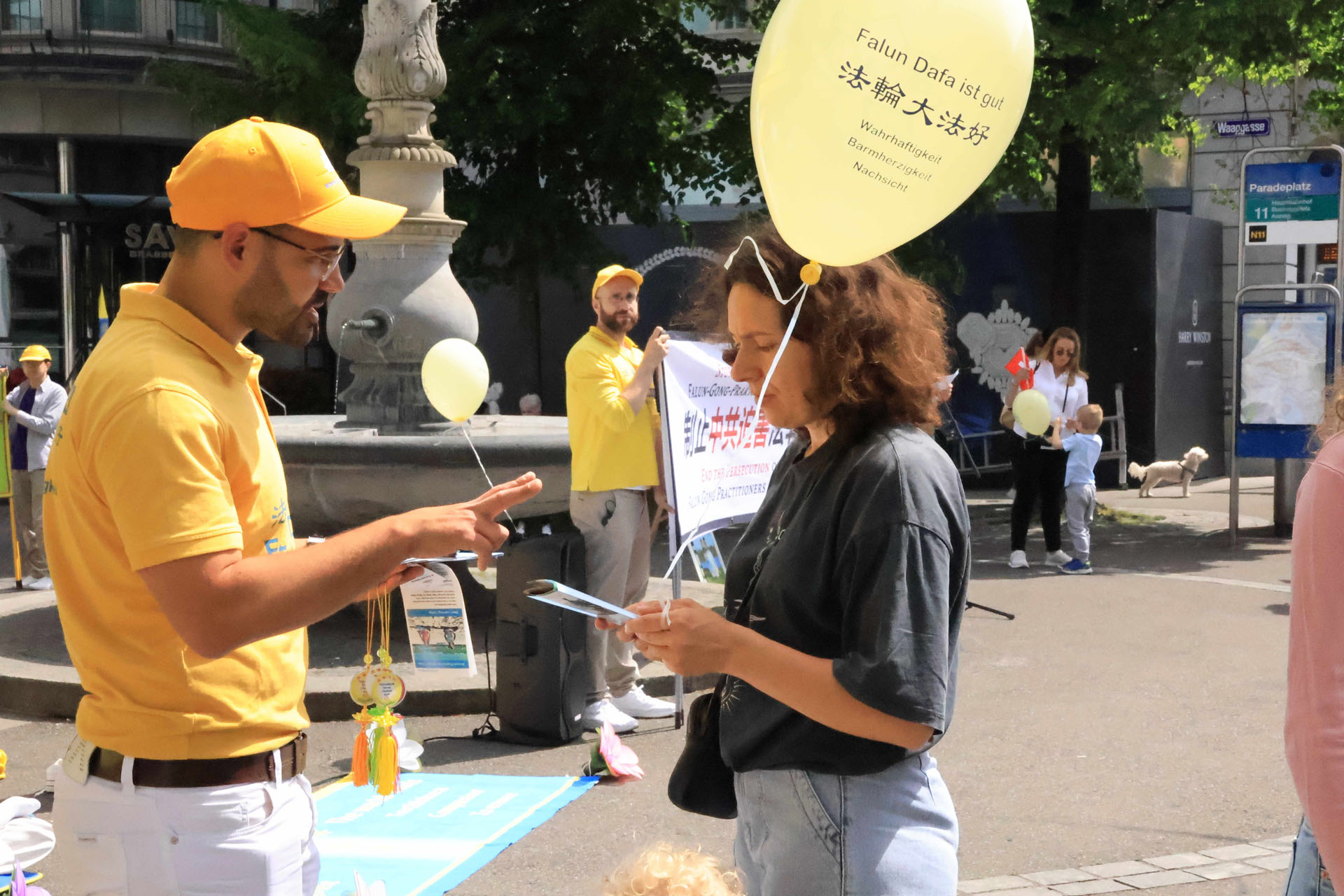 当天瑞士法轮功学员在军械库广场(Zeughausplatz)向人们展示法轮大法的美好,也介绍了世界法轮大法日的由来: