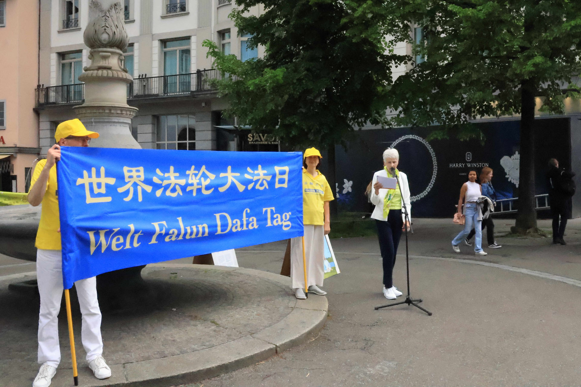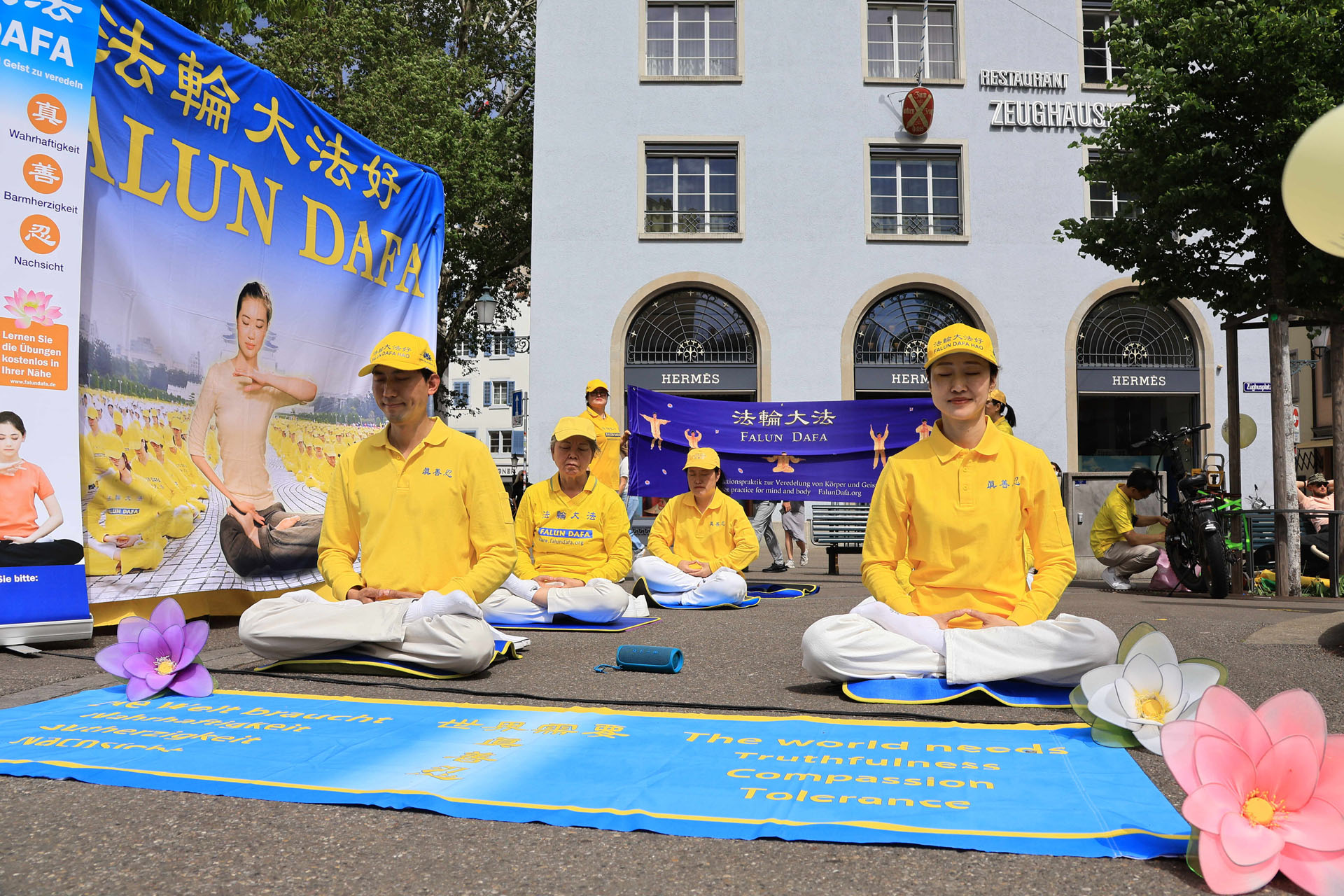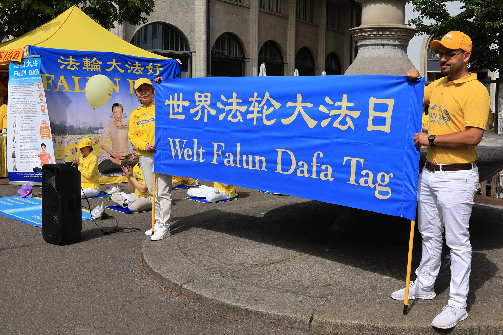 当天瑞士法轮功学员在军械库广场(Zeughausplatz)向人们展示法轮大法的美好,也介绍了世界法轮大法日的由来: