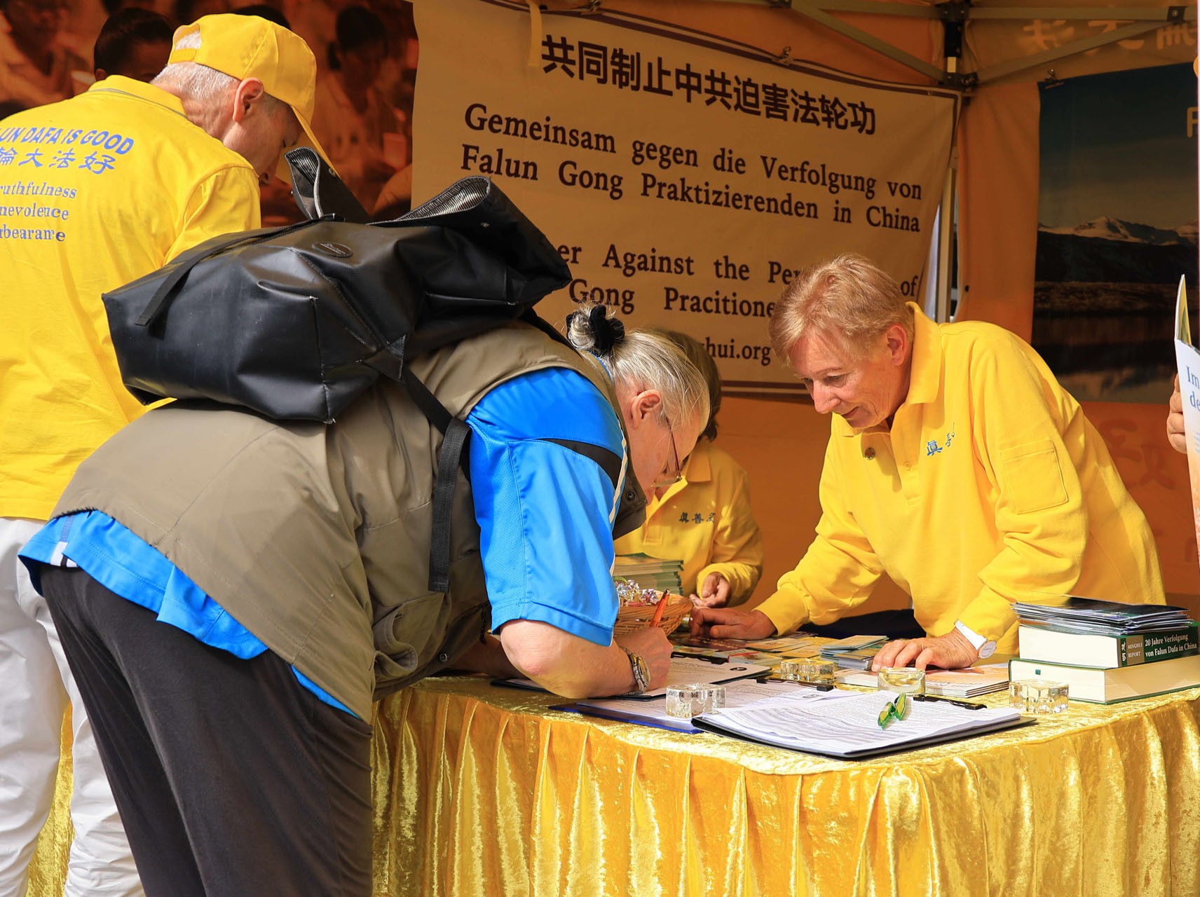 ![]() 图8~9:很多路人在了解法轮大法及二十六年来在中国发生的种种,很乐意签名支持法轮功学员 |
