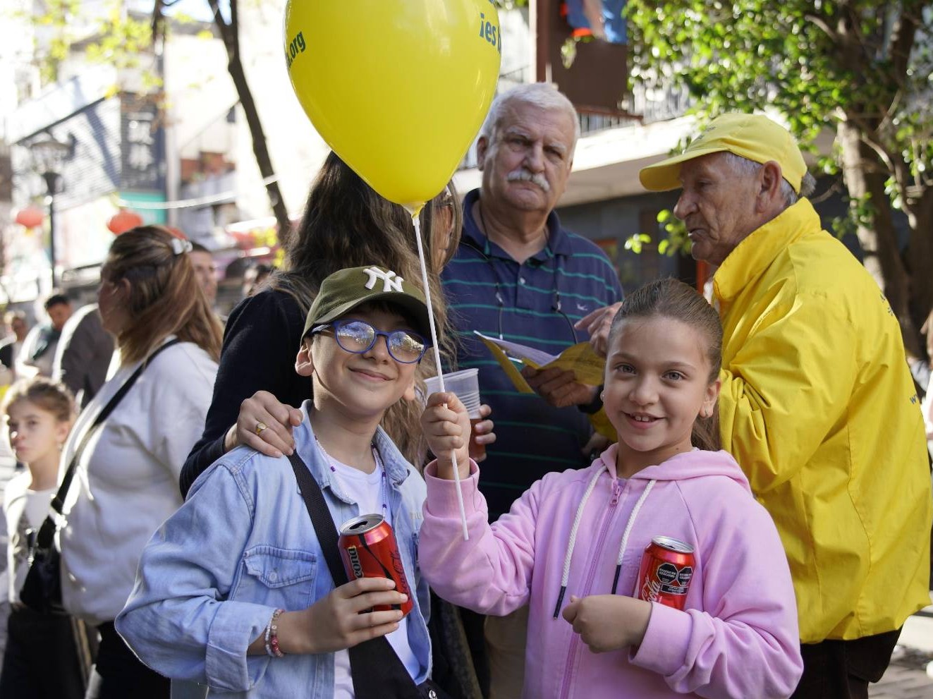 学员们身着明亮的黄颜色服装,在人群中格外醒目,他们手举写有西班牙文和中文的“法轮大法好”横幅,并向路人派发气球。民众纷纷上前询问真相信息,许多人微笑着接受气球和其它真相资料,他们中包括不少中国人。