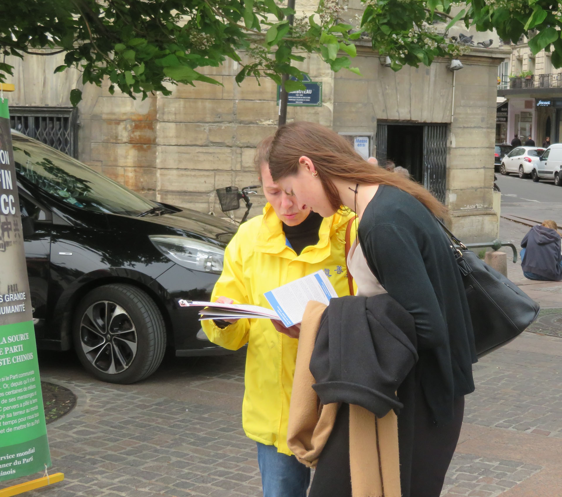 莉莉-塔莫尔(Lily Tamer)女士曾经是记者。六月六日这天她在美丽城遇见法轮功,得知中共活摘法轮功学员器官真相后,她非常震惊。她说她读很多书,读世界大报,不断了解更多信息。她责问:“为什么没有媒体报道此事?”她知道有很多酷刑折磨,活摘这样的事情她第一次听说。