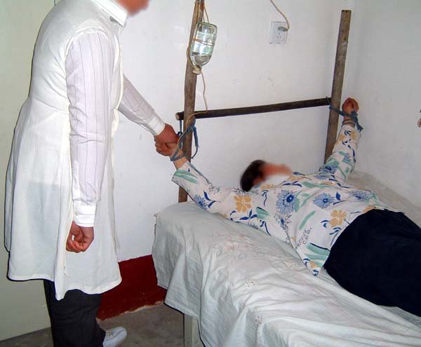 二零零四年五月,杨秀华拒绝穿囚衣,被吊绑于床头,致使两个胳膊到现在还粗细不均。