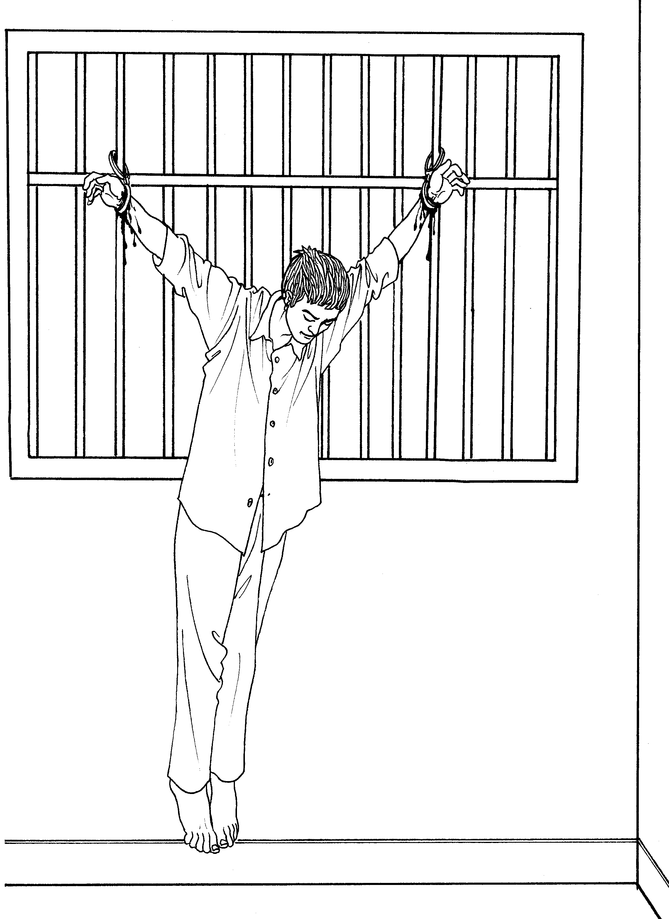 2、“小房”吊铐、驱风油烟熏鼻孔。二零一零年十二月二十三日晚上,恶徒把何镜如弄到主楼专供迫害法轮功学员的小房里,把他的双手绑在背后,在铁窗上吊了三天三夜。何镜如不放弃信仰,恶徒又将驱风油洒在卫生巾上用火点着,冒出烟和驱风油味,直接薰在何镜如的鼻孔里。何镜如被放下来后,已经不会动了。恶徒朱水泉说何镜如是装的,就用牙签刺何镜如的手背,发现毫无反应才罢手。何镜如被驱风油烟薰得太厉害,咳出的痰呈黄泥样,被送到韶关医院检查,诊断是肺部严重感染。