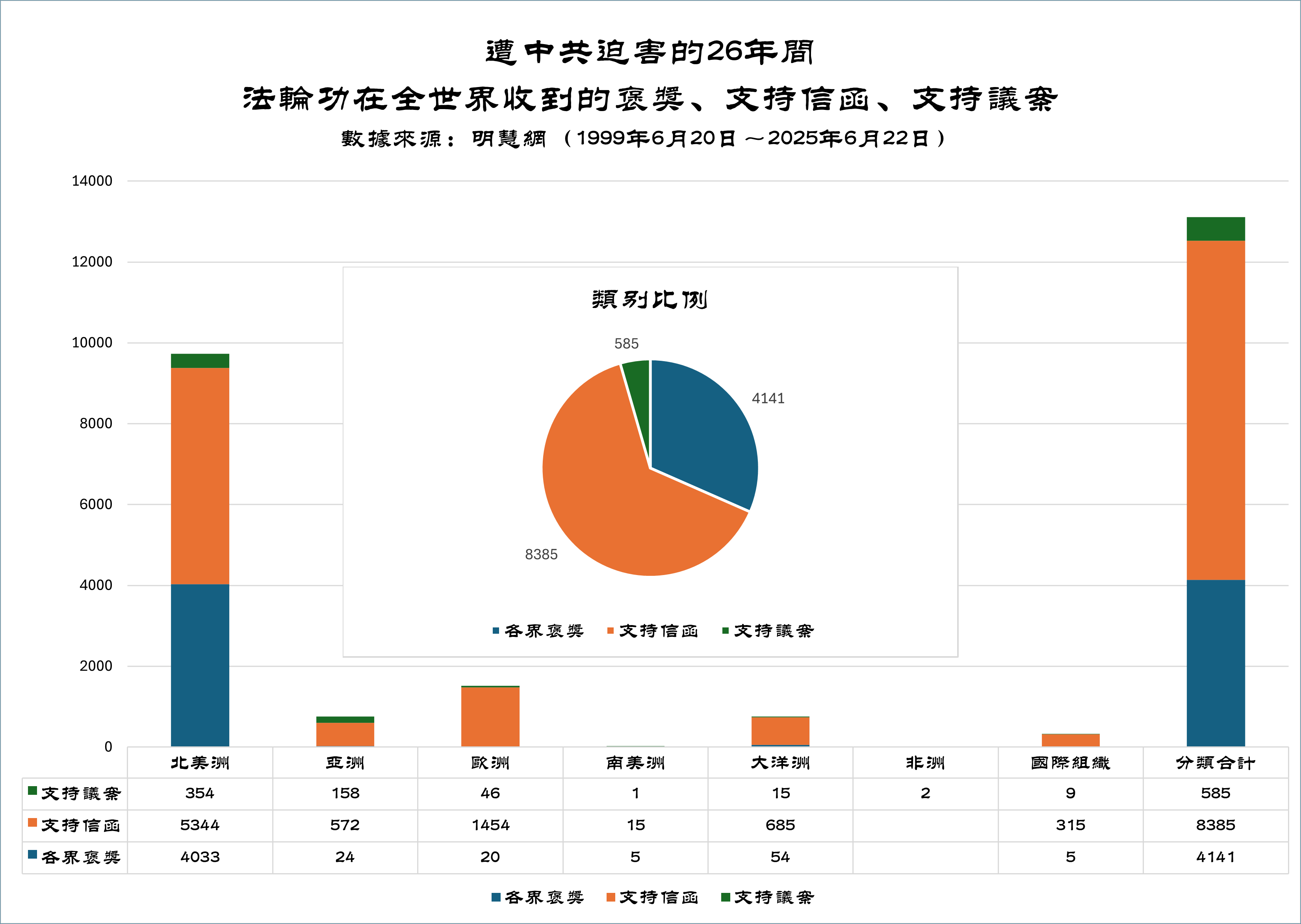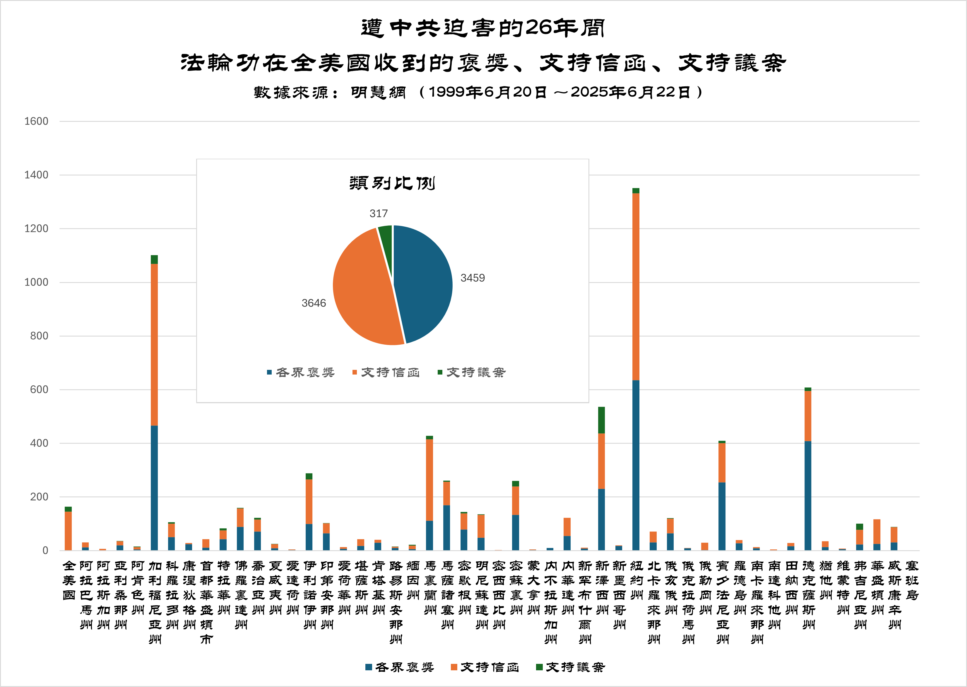 根据明慧网资料,在受迫害的二十六年间,法轮功所收到全世界的褒奖、支持信函、支持议案约一万三千件。其中,從美国各州及联邦收到的超过七千四百件,约占总数的57%。以下分别是全球和全美的统计图表: