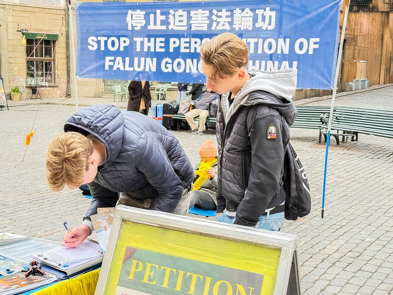 【明慧网二零二五年六月四日】(明慧记者何平斯德哥尔摩报道)每年的五月是瑞典斯德哥尔摩春夏之交的浪漫时节,鲜花盛开,阳光明媚。二零二五年五月份每个周五和周六的下午,在位于斯德哥尔摩老城附近的诺贝尔博物馆(Nobelmuseet)门前,游人如织,来自世界各地的游客及当地民众都会看到法轮功学员在此地举办的讲真相、反迫害征签活动。