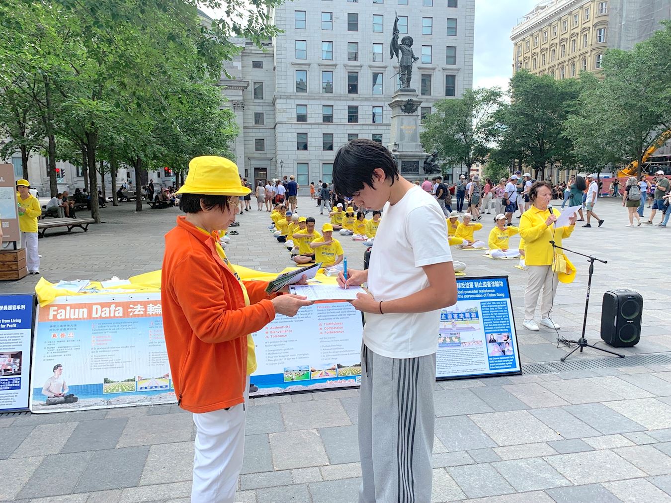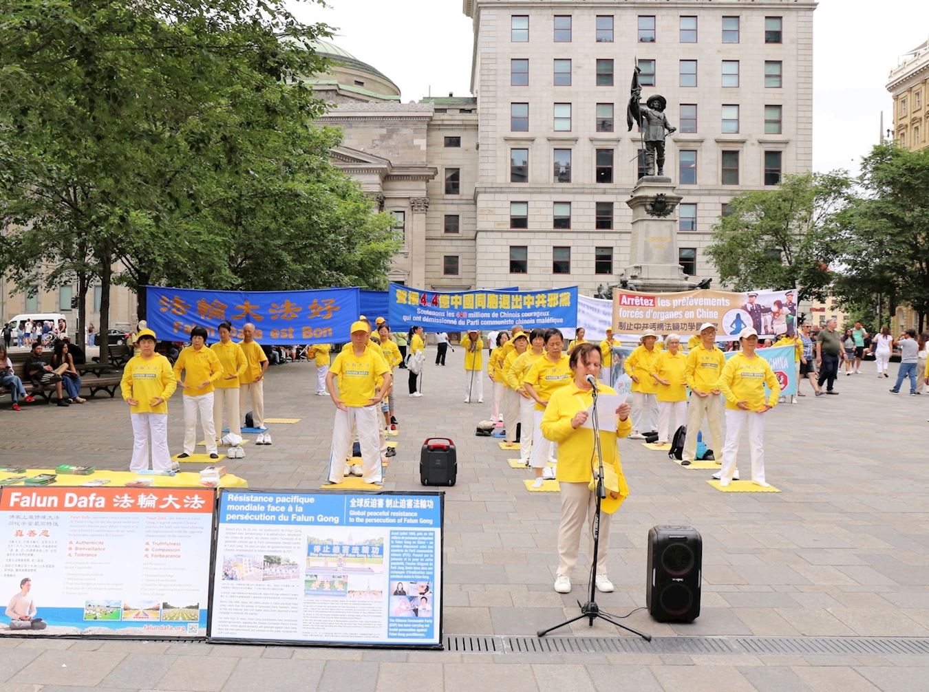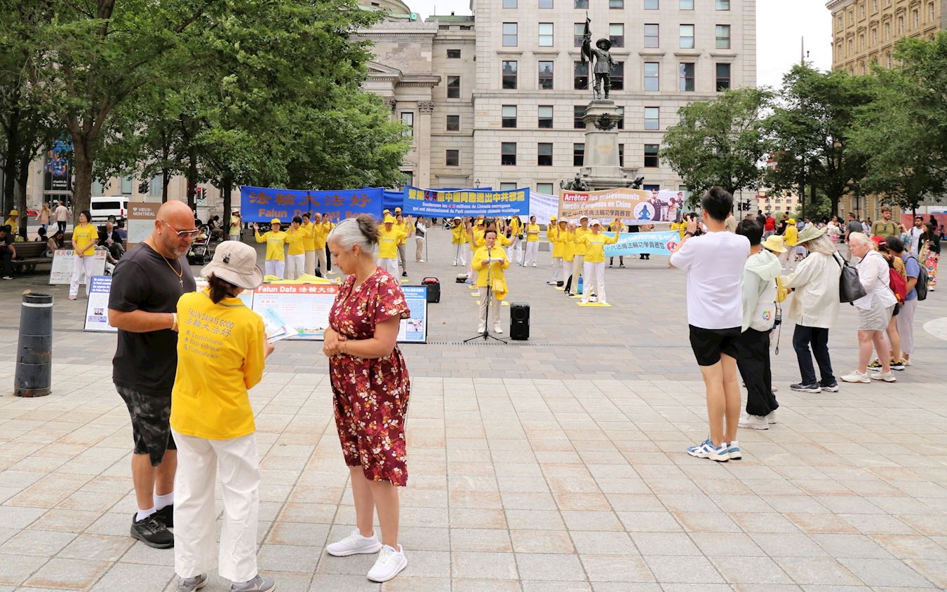 【明慧网二零二五年七月一日】二零二五年六月二十九日,蒙特利尔部分法轮功学员在老城兵器广场举行集会,声援4.4亿人退出中共党团队组织,同时让更多民众了解中共反人类的本质,共同制止中共对法轮功的迫害。中国民众在全球退党服务中心网站上登记,声明退出中国共产党、共青团、少先队等中共组织,叫做“三退”,迄今为止有超过四亿四千八百五十万人办理了三退。