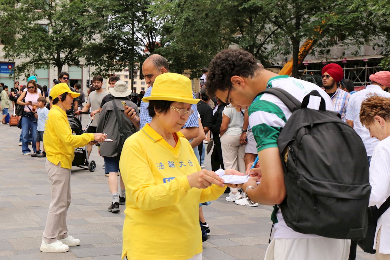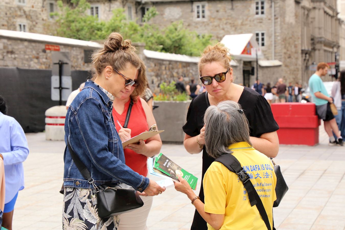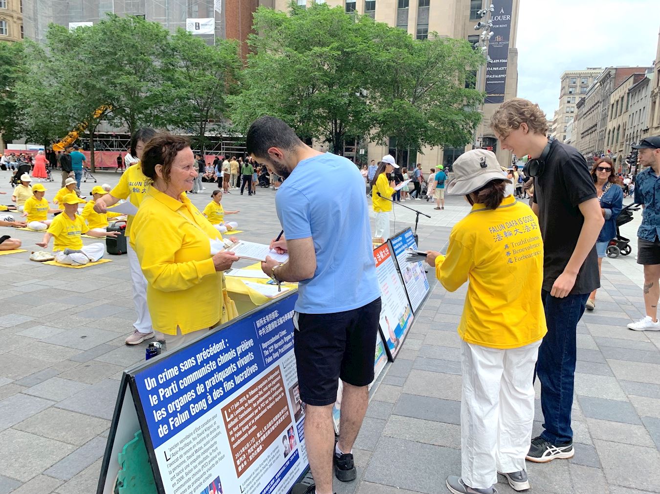 【明慧网二零二五年七月一日】二零二五年六月二十九日,蒙特利尔部分法轮功学员在老城兵器广场举行集会,声援4.4亿人退出中共党团队组织,同时让更多民众了解中共反人类的本质,共同制止中共对法轮功的迫害。中国民众在全球退党服务中心网站上登记,声明退出中国共产党、共青团、少先队等中共组织,叫做“三退”,迄今为止有超过四亿四千八百五十万人办理了三退。