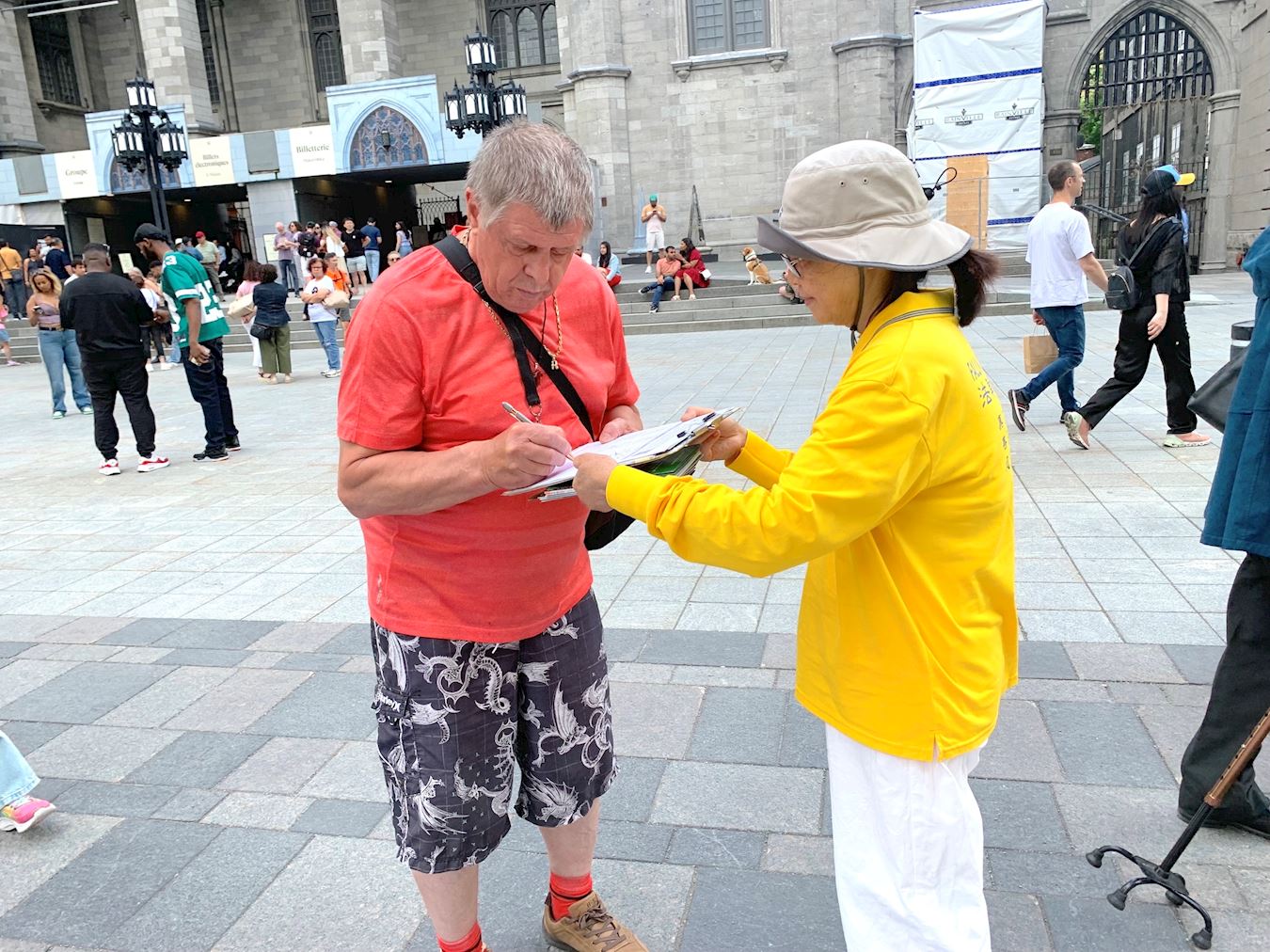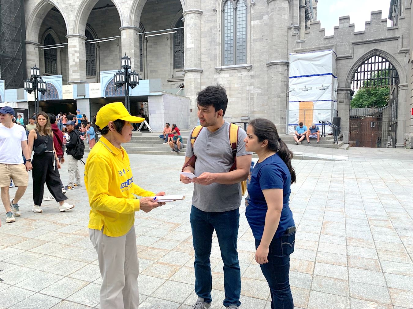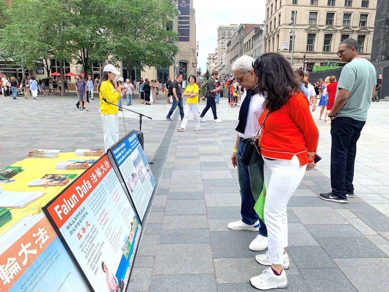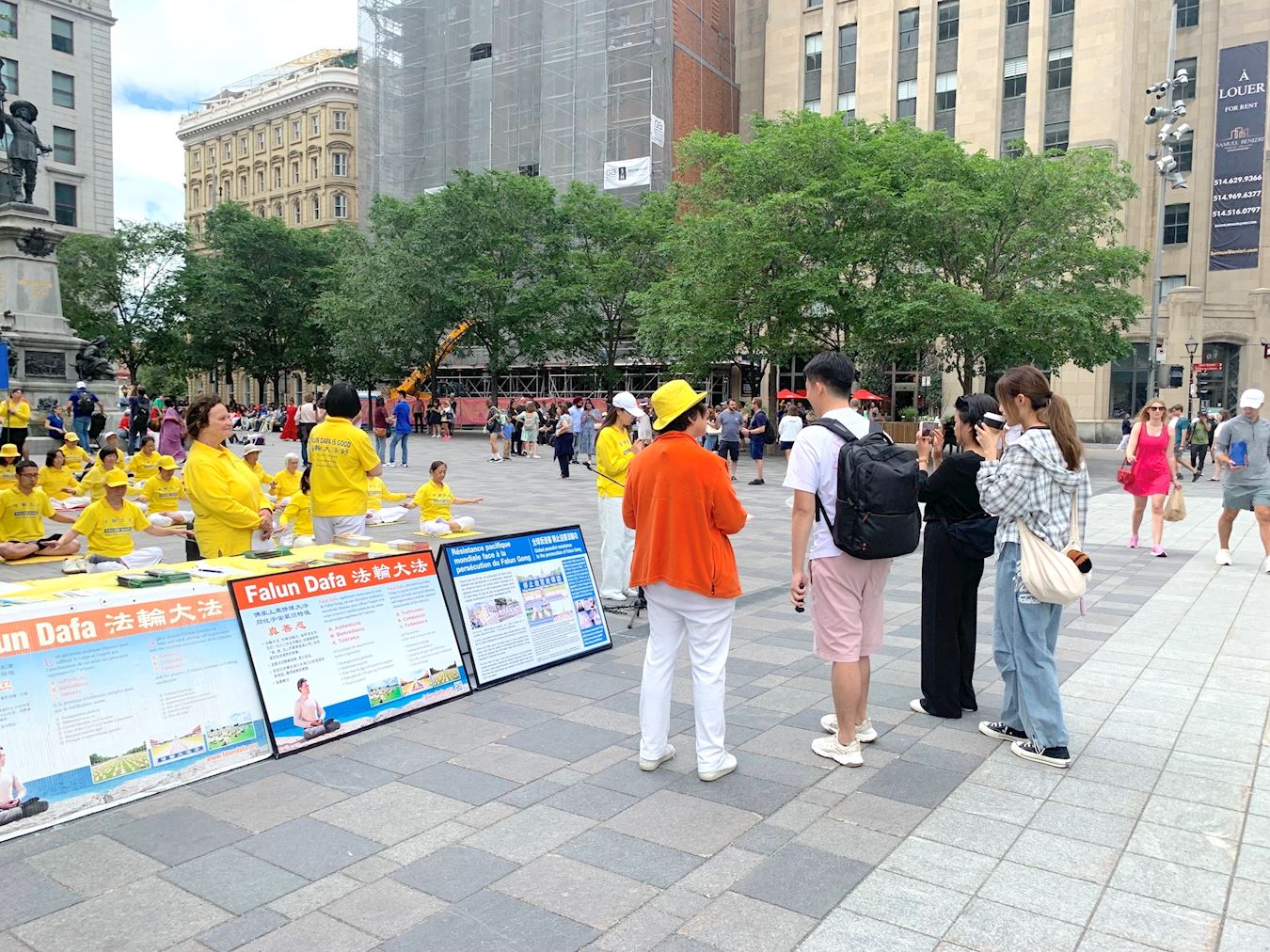 兵器广场是蒙特利尔知名景点,蒙特利尔标誌性建筑——圣母大教堂、蒙特利尔圣母圣殿、圣叙尔皮斯神学院、纽约人寿保险大厦均坐落于此,也是游客必经之地。法轮功学员这次举办的集会,吸引了各国游客的关注。