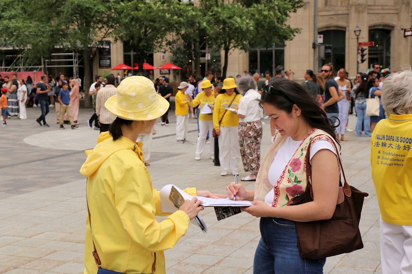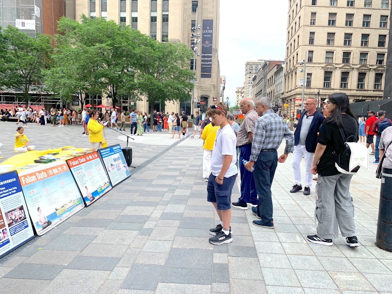 '图1~3:二零二五年六月二十九日,蒙特利尔部份法轮功学员在老城兵器广场举行集会,声援4.4亿人退出中共党团队组织。'