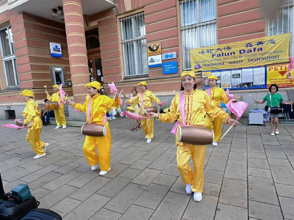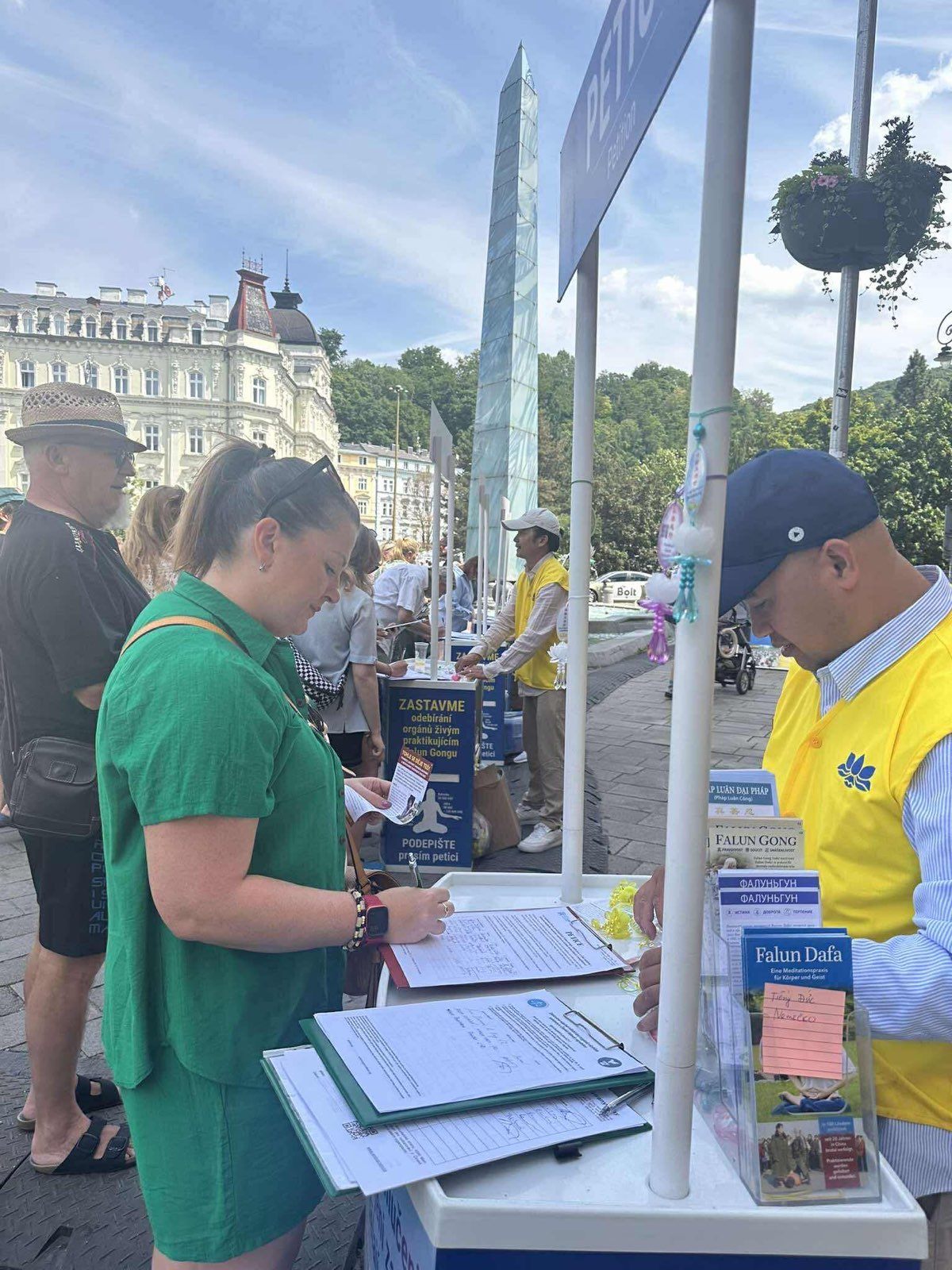 在卡罗维发利国际电影节期间,法轮功学员向宾客介绍法轮大法的核心原则真、善、忍,并唤起人们关注中共对人权的迫害。