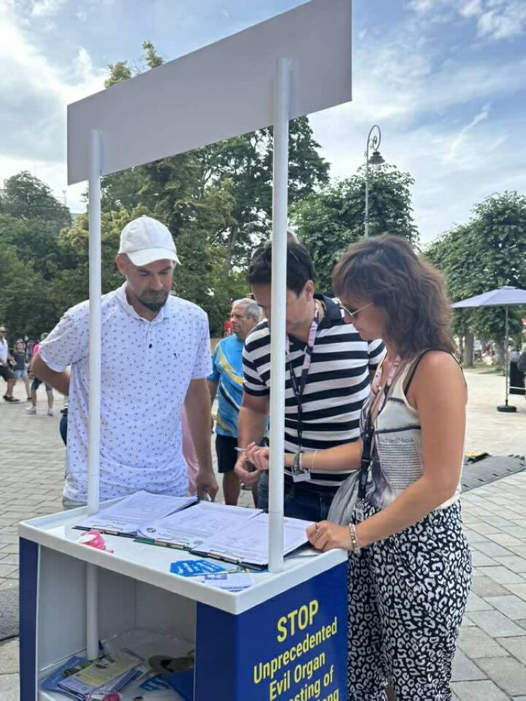 展位设在一处安静而有阴凉的地方,路人可以领取传单,与学员交谈,并签署请愿书。活动氛围平和、庄重。学员们向人们介绍了法轮大法的核心原则真、善、忍,并讲述了法轮功在中国遭受中共迫害的情况。