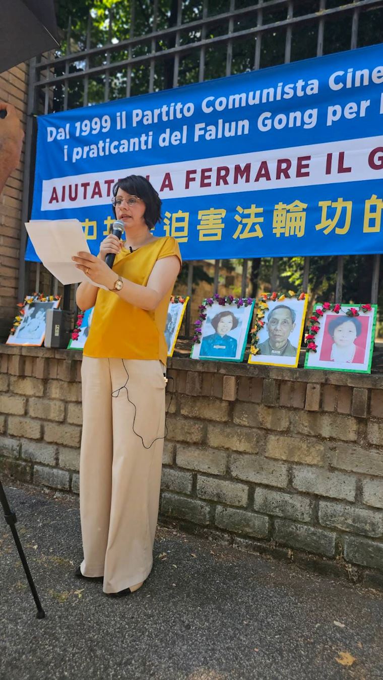活动期间意大利法轮大法学会主席卡特琳娜·安杰拉科普洛(Katerina Angelakopoulou)女士宣读了和平请愿书“制止中共迫害法轮功”,历数二十六年来中共对法轮功修炼者的残酷迫害。