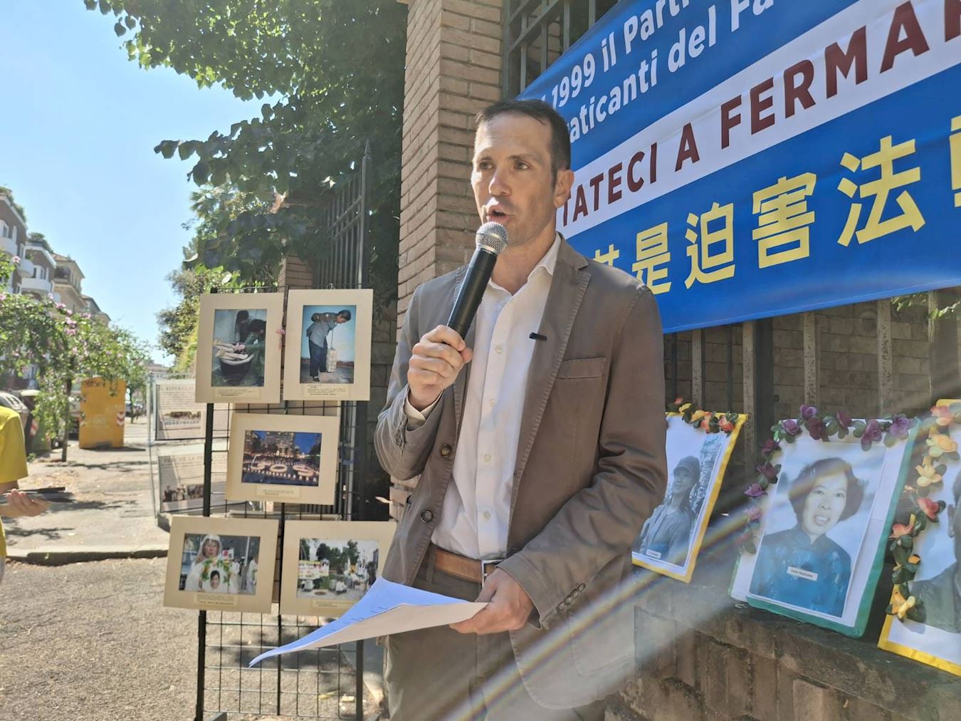 '图4:皮特兰杰罗·马萨罗(Pietrangelo Massaro)来到中共大使馆前法轮功学员集会现场并发言'