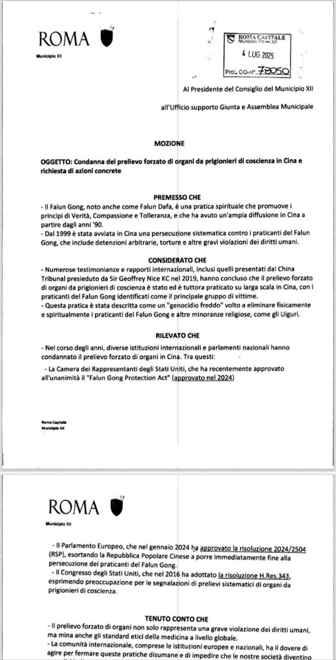 图5:已向罗马市政府提交的“制止迫害法轮功”的动议原件