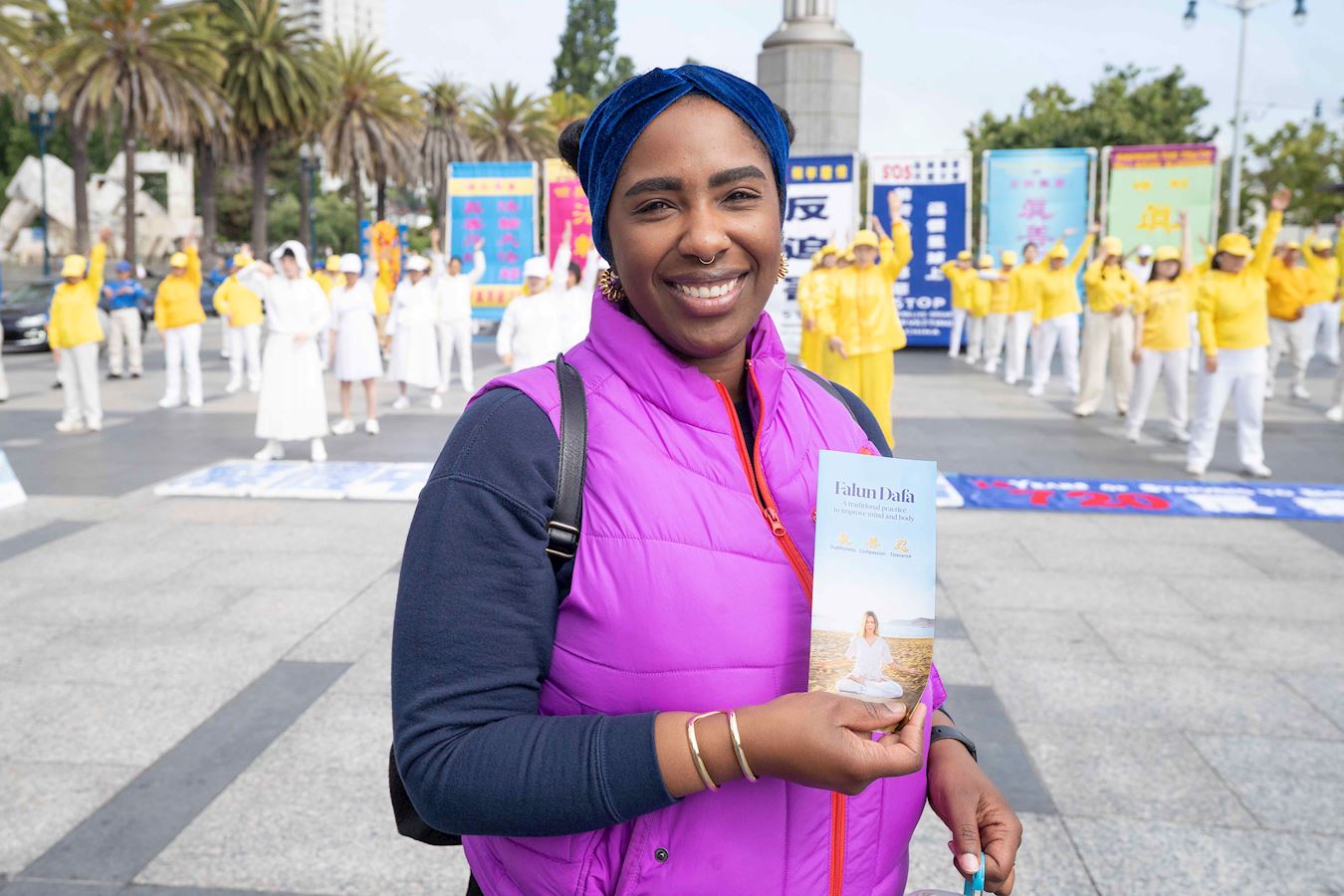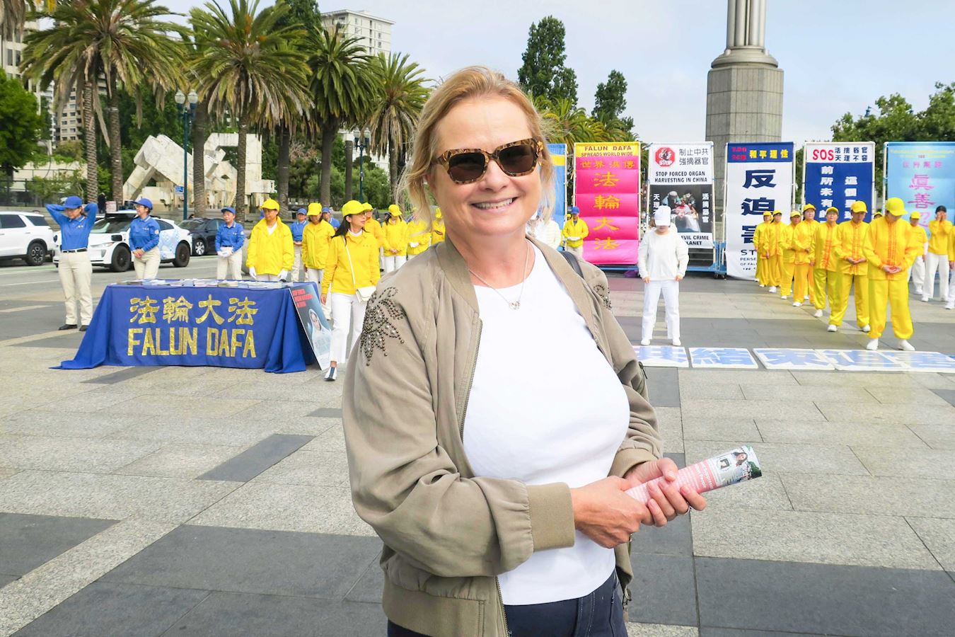 旧金山居民玛丽·安妮(Mary Anne)表示,她以前看见过法轮功学员炼功。她说,“每个人都应该遵循真、善、忍。现在有些人在散布谎言,所以我们需要真。我们应该善待彼此,宽仁大度。”