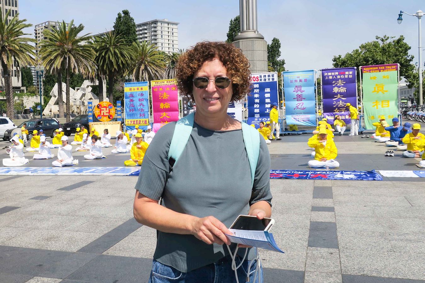 从以色列来旧金山旅游的萨拉·加尔(Sara Gal)经过时,驻足了解中共对法轮功的迫害。加尔表示,“当我听到中共强摘器官非法贩卖,让我联想到之前我参观过的人体展,当时我就怀疑这些人体的来源,他们可能是受中共迫害的人。今天我确认了那些都是非法盗取来的。法轮功学员所遭受的迫害太残酷了。”