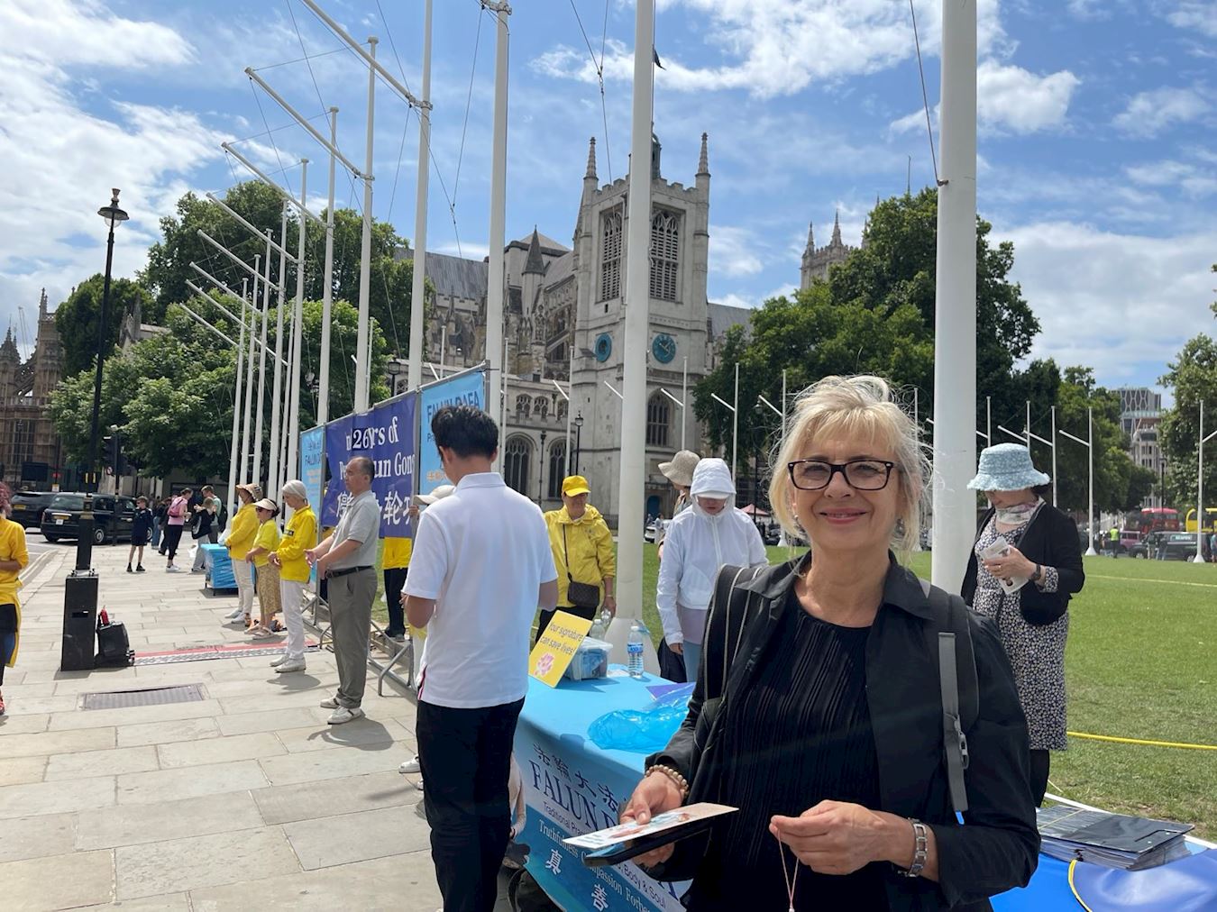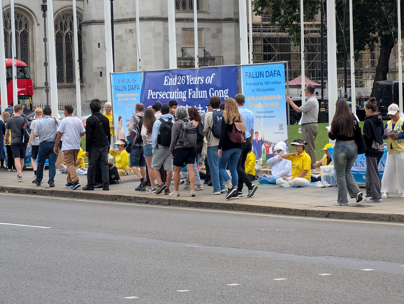 在议会大厦举办研讨会的当天,法轮功学员在议会外广场弘法,讲真相,吸引了众多路人驻足了解。